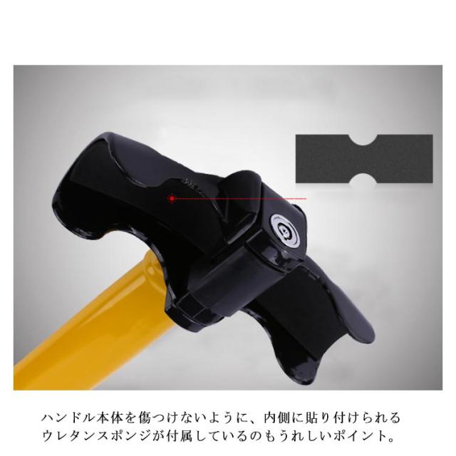 | ワンタッチで簡単にロックできるハンドルロック。 付属のキーを回すだけでロックをかけたり解除したりできる鍵式が魅力。 専用キーは2本付属しているので万が一鍵を紛失した時も安心です。 高硬度の合金鋼で製造されており、簡単に切断されることはありません。 ハンドル本体を傷つけないように、内側に貼り付けられるウレタンスポンジが付属しているのもうれしいポイント。 目立ちやすいイエローカラーを採用しており、盗難抑止効果が期待できます。 直径約30mmまでのハンドルに装着できます | |