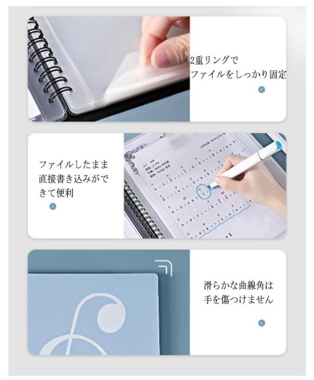 | 学校の吹奏楽部や趣味のサークルなどで大活躍の楽譜ファイルです。 楽譜をポケットに入れるのではなく上下・横側で挟むタイプのファイルなので、楽譜を取り出すことなく書き込めます。 授業や練習でもすぐにメモ出来てとても便利です! 透明のポケット型のように光の反射で楽譜が見えなくなるということもありません。 カバーが頑丈な作りなのでバッグに入れて毎日持ち運んでも中の楽譜を傷めることがありません。 表紙も音楽を意識したデザインになっていますので部活動へのモチベーションも向上します。 | |