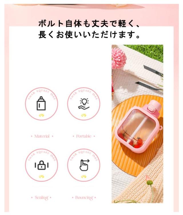 | 700mlの大容量!ストロー透明可愛い方形ウォーターボトル。 幅広く耐久性に優れるストラップ付属で、持ち運びや吊り下げが便利です。 ボルト自体も丈夫で軽く、長くお使いいただけます。 常温で水分補給をするアスリートや、ヨガやジムなど、スポーツシーンで大活躍のボトルです。 フタを閉める時にボトルを傾けたり揺らしたりしないでください。飲み物があふれ出たり、火傷や物が汚れる原因になります。 バッグに入れる時は縦置きにしてください。フタがズレていたりすると飲み物が漏れて物を汚す原因になります。 50℃以下の熱い飲み物を入れる時はボトルが非常に熱くなりますので、布などでボトルを覆ったり手袋を使用してください。 コンロ等の火のそばや直射日光など火気や高温になる場所に近づけないでください。火災の原因や変形変色、やけどなどの原因になります。 | |