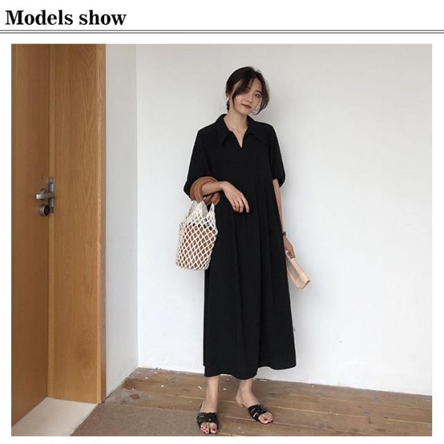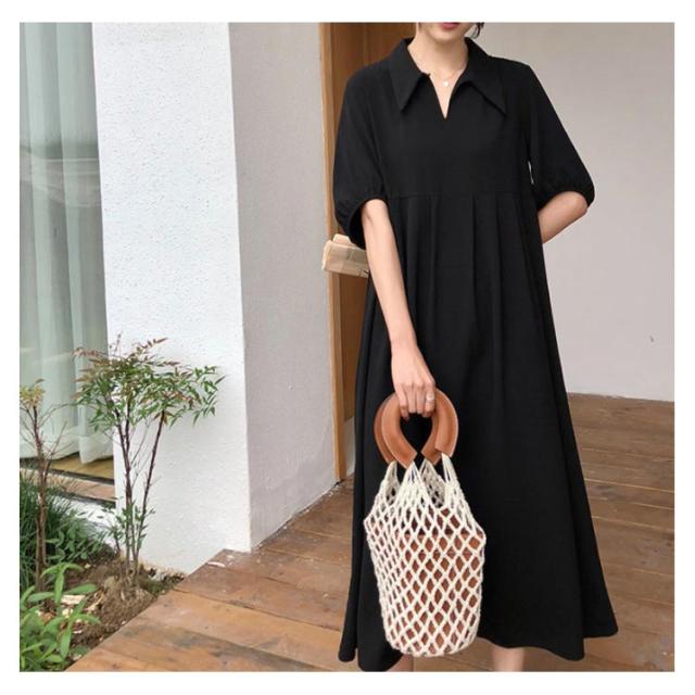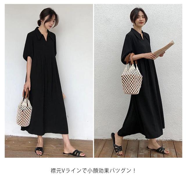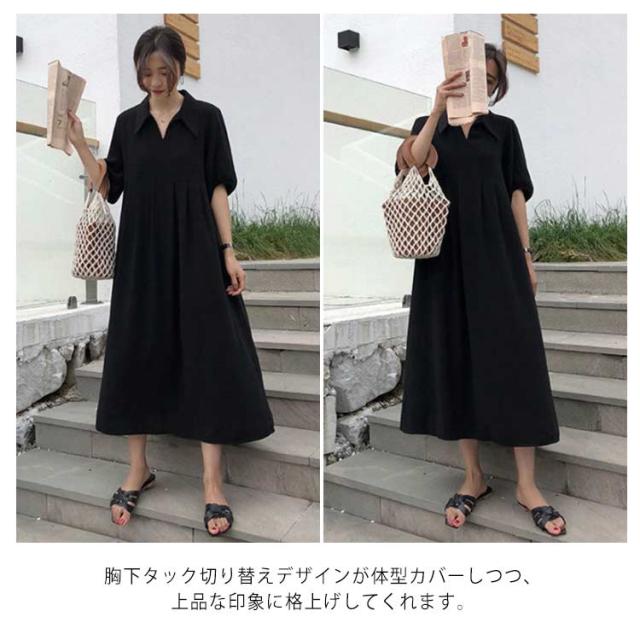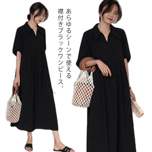 送料無料 襟付き ワンピース 半袖 黒 体型カバー Aライン 冠婚葬祭 着痩せ ロング丈 レディース マキシ丈ワンピース 無地 可愛い フォーマル