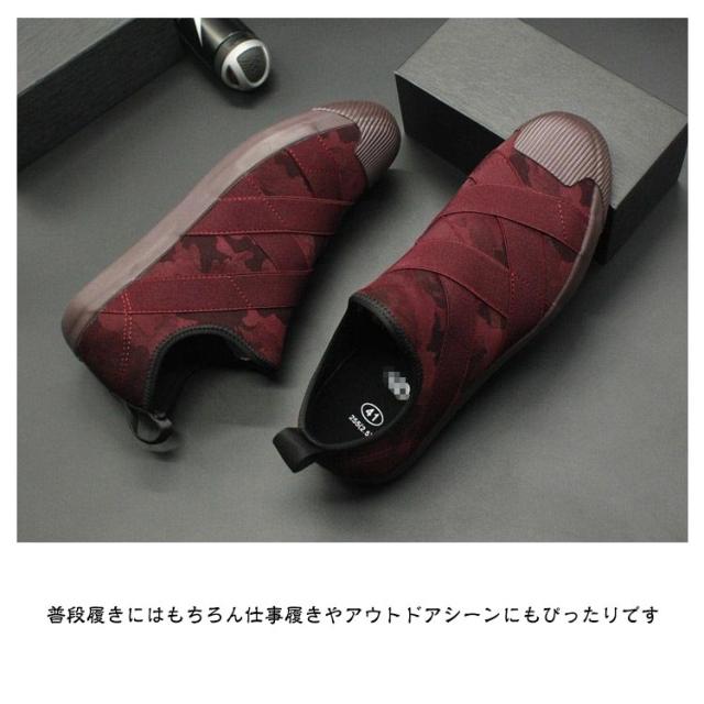 | シンプルでお洒落なメンズスリッポンシューズ。 キャンバス素材にバンドをクロスに施したデザイン。 スポッと履けて脱ぎ履きらくらく。 靴ひもの代わりとなるスポーティーな伸縮バンドのアッパーが、足をぴったりと快適に包み込みます。 靴紐を結ばずフィットするので、サッと履けて快適です。 取り外しのできるインソールは通気性が良く、蒸れにくく、歩行も快適です。 普段履きにはもちろん仕事履きやアウトドアシーンにもぴったりです。 | |