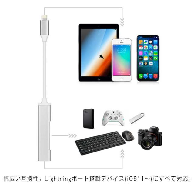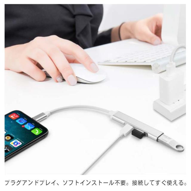 | OTG機能搭載でスマホやタブレットとUSB機器を直接つなげ、PCを介さずUSBメモリにデータ転送ができる。 ダブルUSB3.0ポート搭載で、iphoneなどのLightningデバイスのポート拡張に最適。 USB3.0規格なので、充電しながらデータ高速転送可能。 幅広い互換性。Lightningポート搭載デバイス(iOS11〜)にすべて対応。 プラグアンドプレイ、ソフトインストール不要。接続してすぐ使える。 軽量小型、携帯便利。 | |