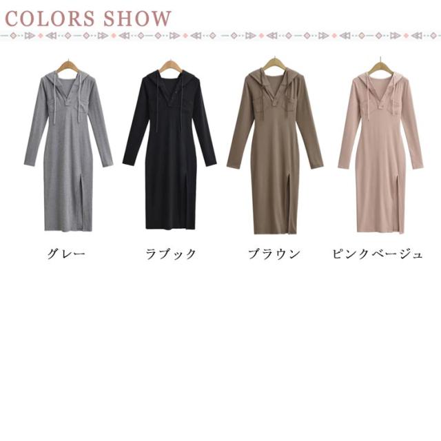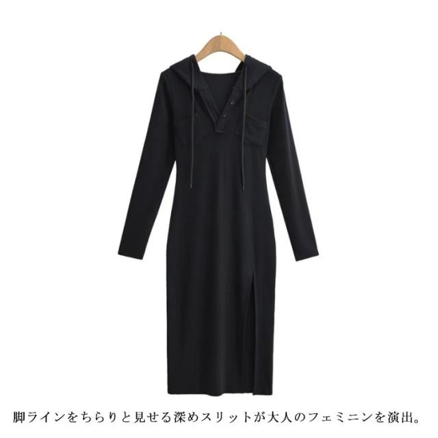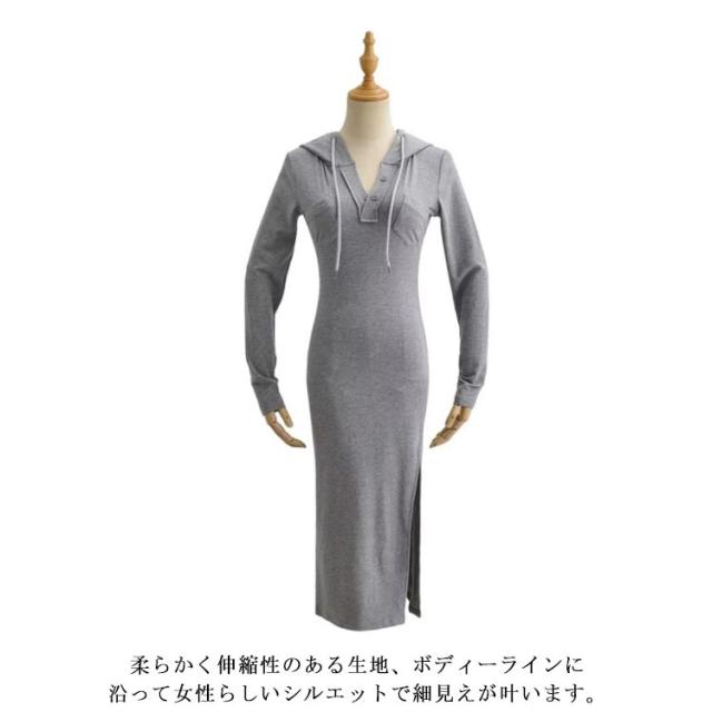 ワンピース スウェットワンピース 長袖 タイトワンピース 送料無料 パーカーワンピース フード付き セクシー スリット ロング丈 ミモレワンピース 20代 30代 40代
