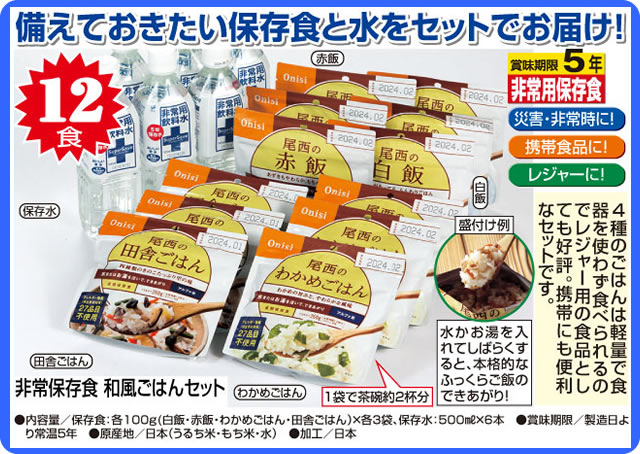 ●内容量/保存食:各100g(白飯・赤飯・わかめごはん・田舎ごはん)×各3袋、保存水:500ml×6本