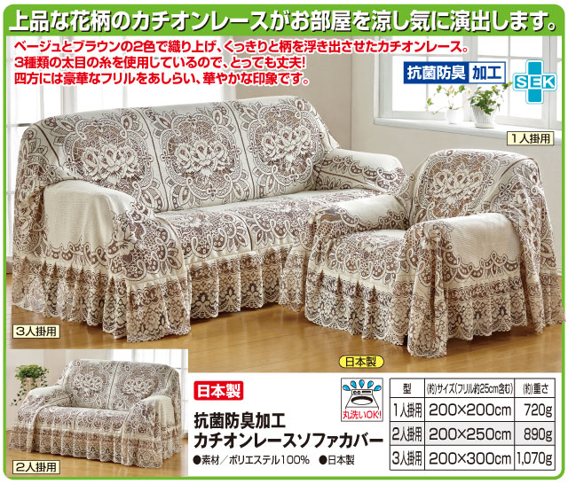 日本製 抗菌防臭加工 カチオンレース ソファカバー 3人掛け用