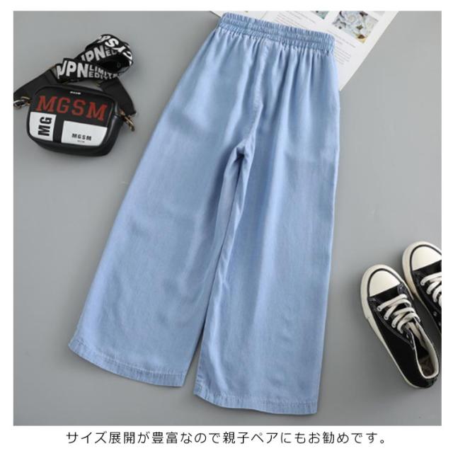 送料無料 テンセル ワイドパンツ キッズ ガウチョパンツ 女の子 七分丈 デニムパンツ 子供服 7分丈 ボトムス 韓国子供服 送料無料 ジュニア 親子ペア ゆったり ウエストゴム リボン カジュアル おしゃれ 柔らかい 薄手 無地 通学 遊園地 夏 110cm-170cm