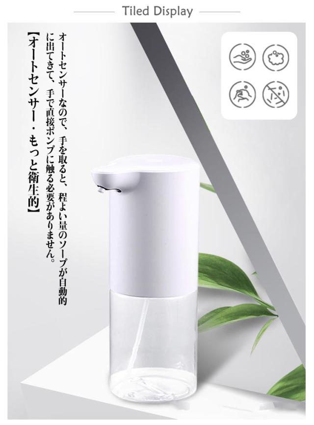 | 【オートセンサー・もっと衛生的】 オートセンサーなので、手を取ると、程よい量のソープが自動的に出てきて、手で直接ポンプに触る必要がありません。 もっと便利、衛生的です。や風邪の流行時期や食中毒の季節にもしっかり除菌できます。 【ふわふわと潤滑の泡】 ハンドソープだけでなく液体洗剤やシャンプーなどにも対応、汎用性の広いオートディスペンサーです。 手洗い用と食器洗い用で使い分けると便利です。 ふわふわの泡で大人だけではなく、お子さんも大喜び、楽しい泡洗いで手洗いを習慣化することも最適です。 (泡タイプのソープは直接に入れて、液体洗剤は水で2倍に希釈してよく混ぜて下さい。) | |