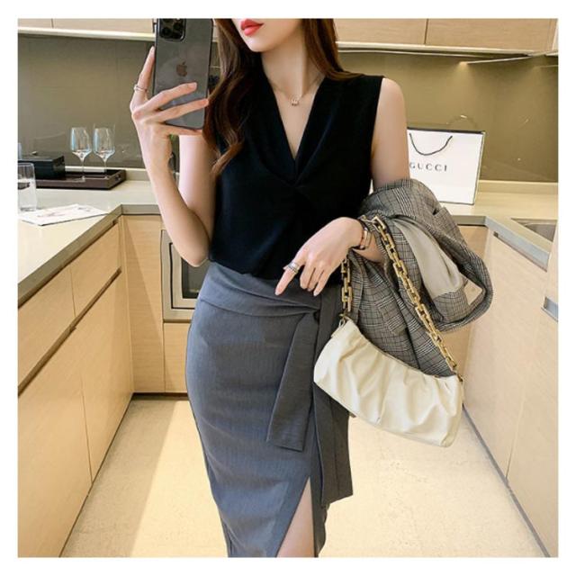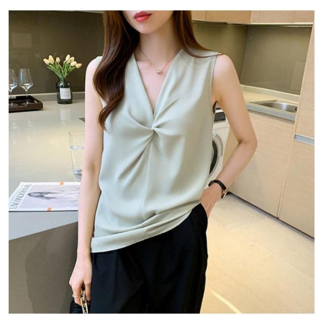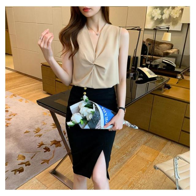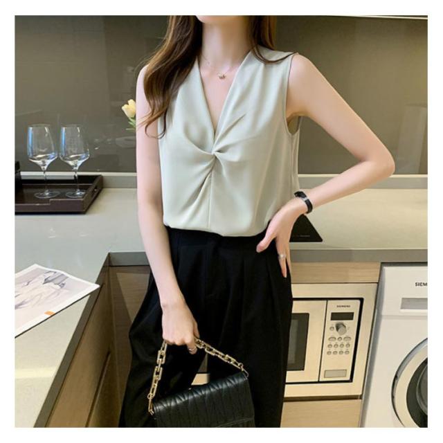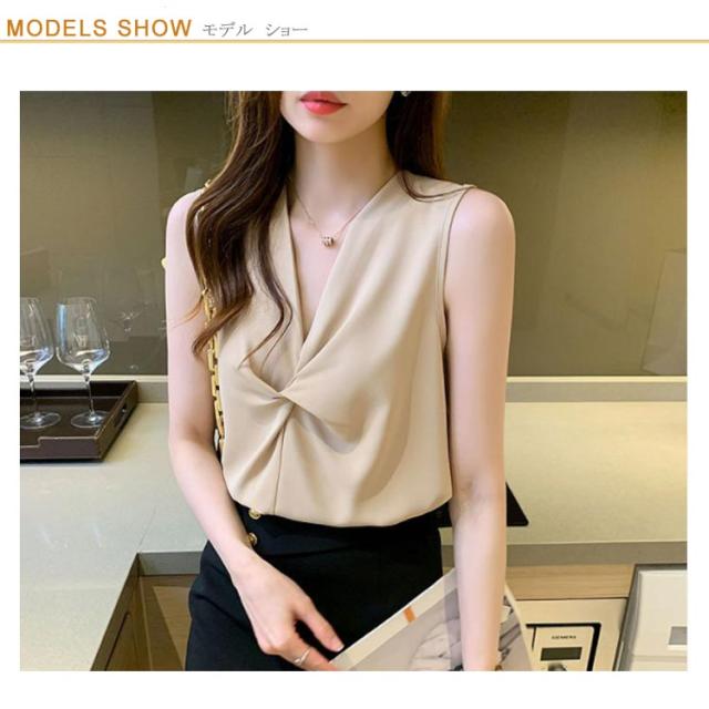 トップス レディース ブラウス ノースリーブ 胸 フリル クロス リボン Vネック シフォンブラウス 通勤 オフィス きれいめ 黒 白 緑 ベージュ 韓国ファッション OL 二次会 パーティー 20代 30代 40代【送料無料】