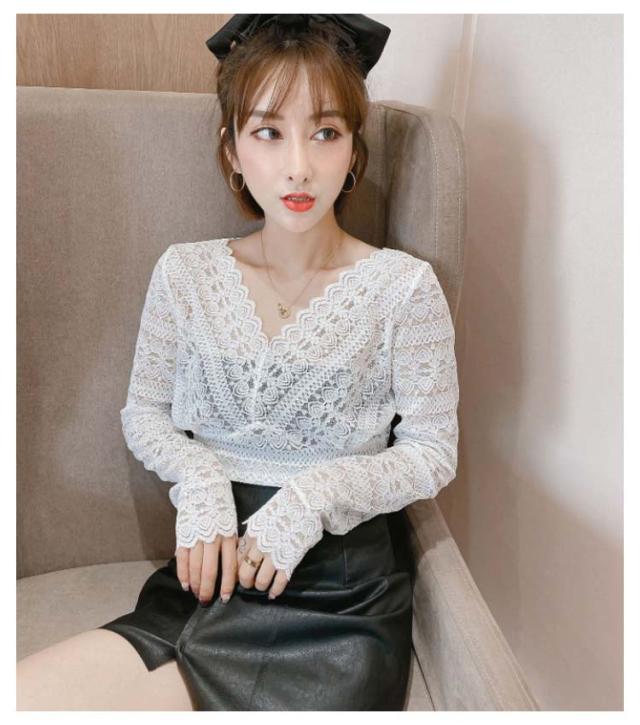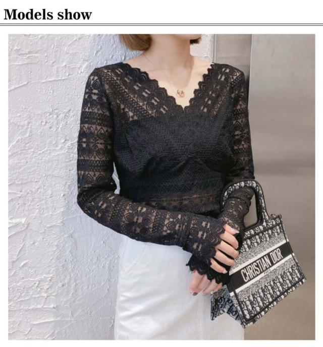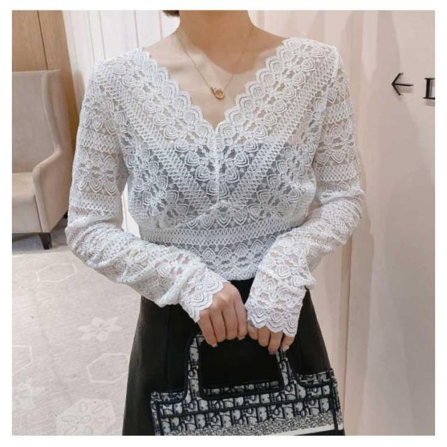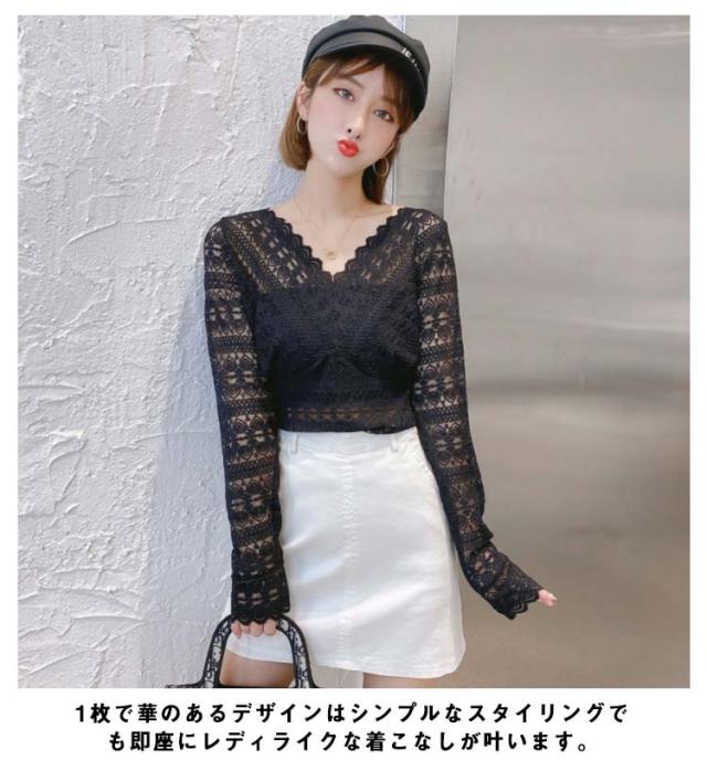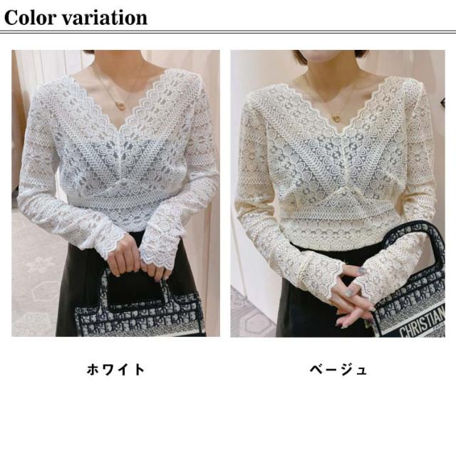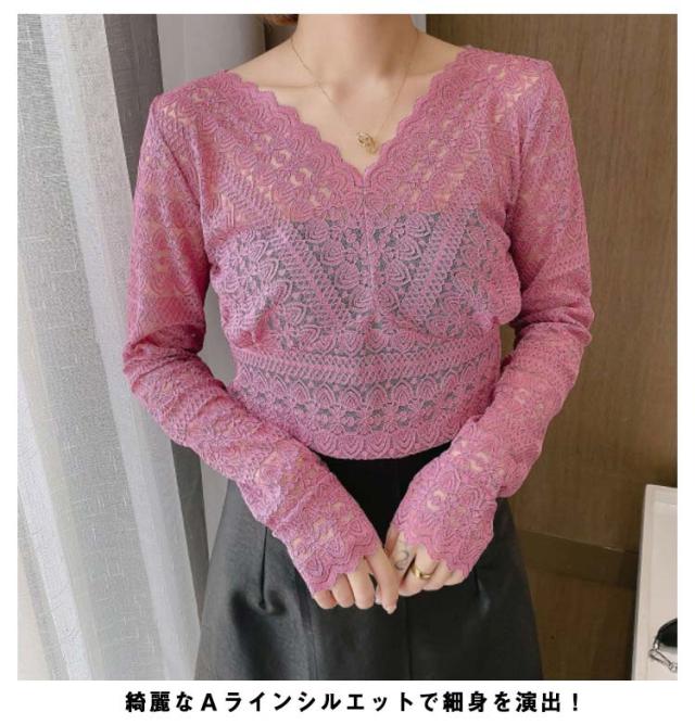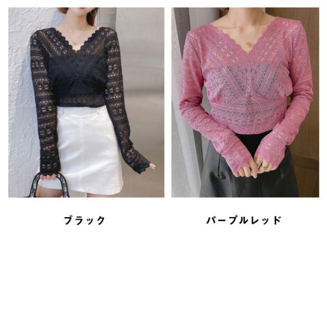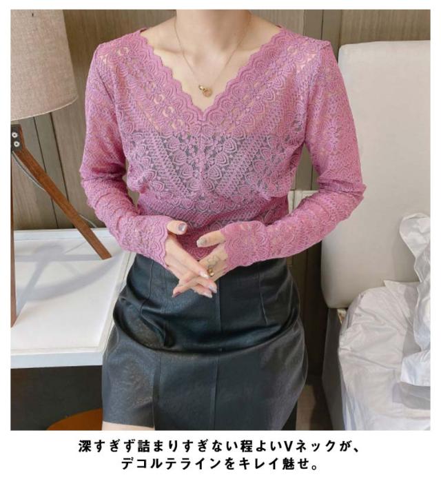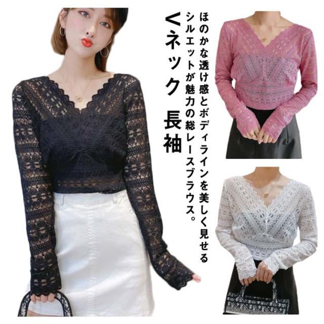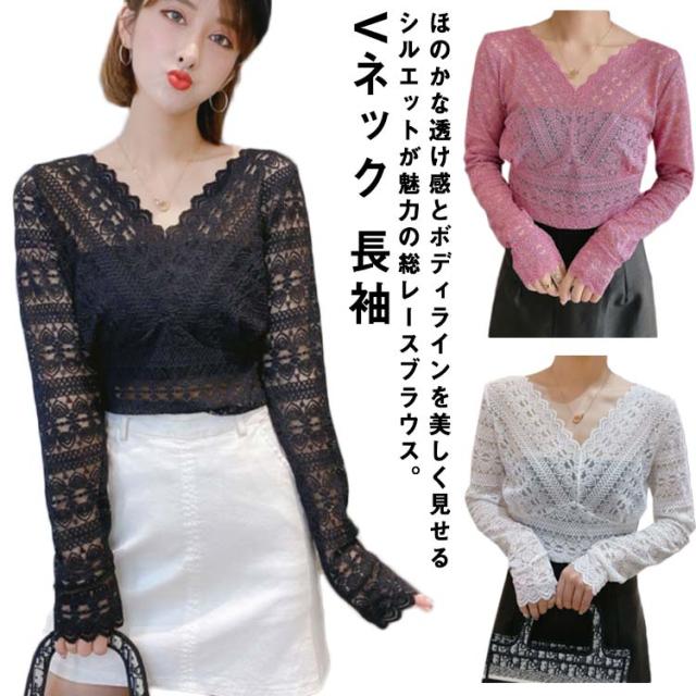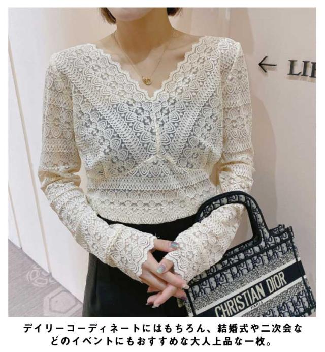 送料無料 花柄 総レース ブラウス レディース Vネック 長袖 透かし彫り シースルー トップス カットソー 着やせ フラワーレース シャツブラウス 透け感 インナー 重ね着 シンプル きれいめ カジュアル フォーマル 結婚式 二次会 パーティー