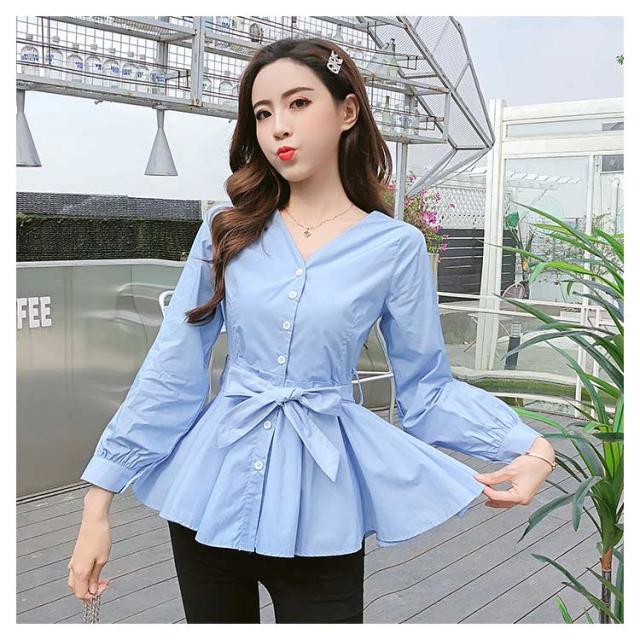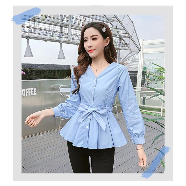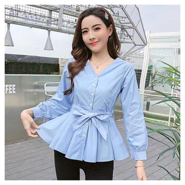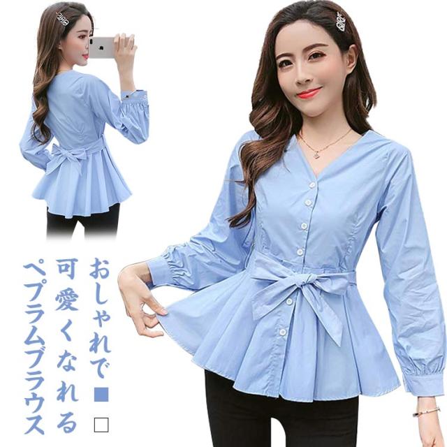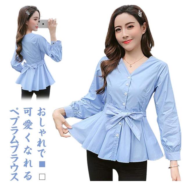 ウエストリボンベルト付きがアクセント!Vネックトップス レディース ブラウス シャツ トップス Vネック フリルブラウス 長袖 リボン Aライン フリル 無地 春 春服 秋 秋服 送料無料