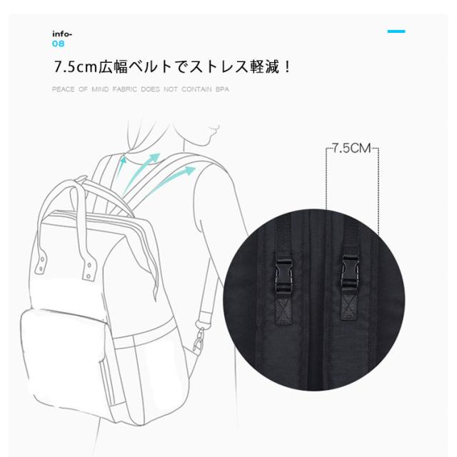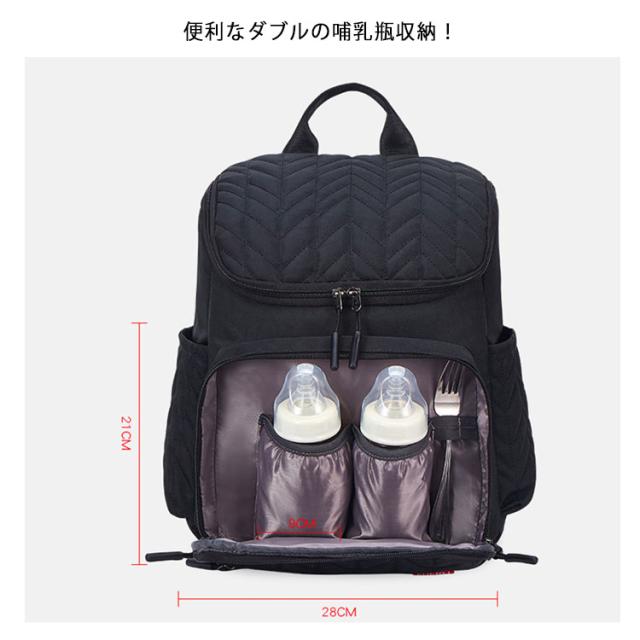| おしゃれなマザーズバッグ!トレンドをおさえた使いやすいシンプルデザイン。お子様連れのお出かけにはマストアイテムです! 大容量の内側スペース、たっぷり入ってお子さま連れのお出かけも楽々。 アルミシート付きの独立ポケットで、高い保温効果が期待できます。 便利なダブルの哺乳瓶収納! 機能性充実!撥水&ベビーカーフック。撥水性のある生地だから雨、子供の水遊び、お茶こぼしも気になりません。いつも清潔に使えて嬉しい。 内側防水加工の仕切りポケット!防水加工のポケットでオムツやぬれたタオルの収納可能! ベビーカーに取り付けできるフック。いつも背負っていたらママの肩は限界!ベビーカーの時は、すぐに取り付けてママの負担を減らせます 便利なおむつ替えシート付! 7.5cm広幅ベルトでストレス軽減! | |