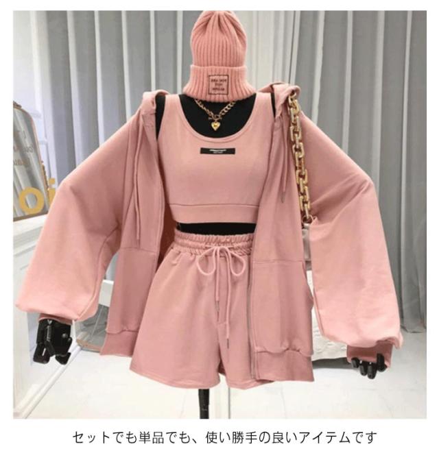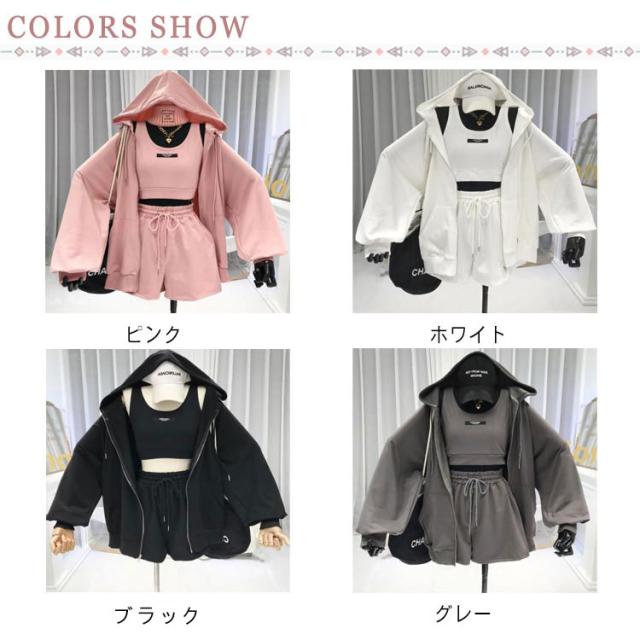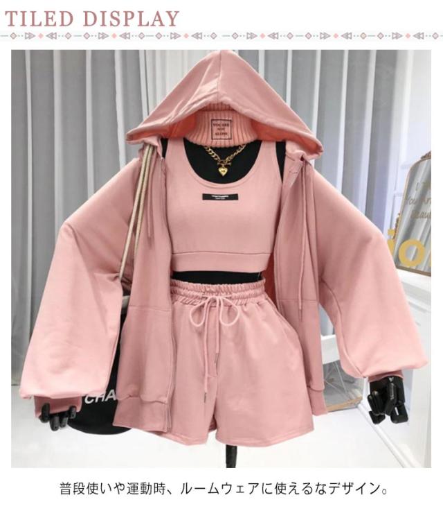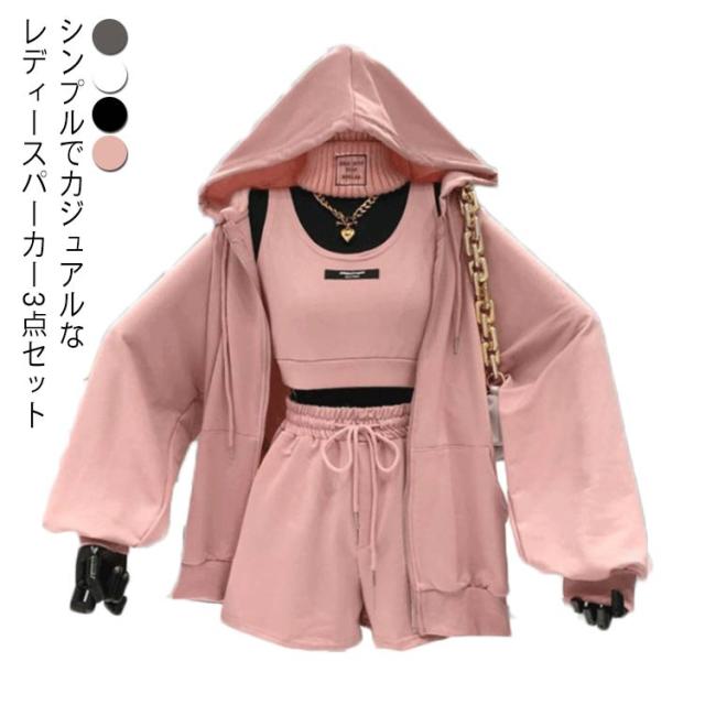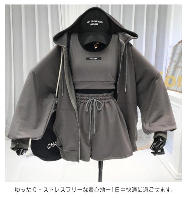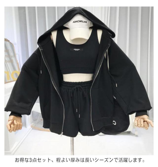 【送料無料】パーカー レディース セットアップ 3点セット おしゃれ かわいい ショートパンツ ボトムス パンツ ルームウェア 部屋着 フード付き ダンス服 スポーティー ジャージ ゆったり 体型カバー シンプル 無地 韓国風 普段着 お出かけ M L XL 2XL