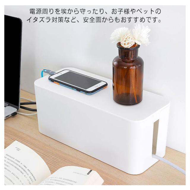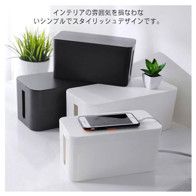 | ごちゃつきがちな配線や電源タップを中に入れるだけ。 汚れなども簡単に拭き取りでき、洗うことも可能です。 電源周りを埃から守ったり、お子様やペットのイタズラ対策など、安全面からもおすすめです。 インテリアの雰囲気を損なわないシンプルでスタイリッシュデザインです。 熱がこもりにくいように設計されています。 蓋の上に小物を置くこともできます。 | |