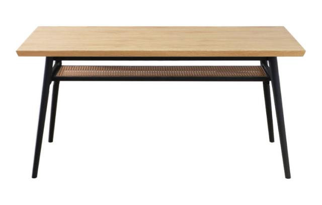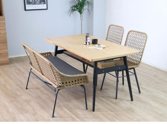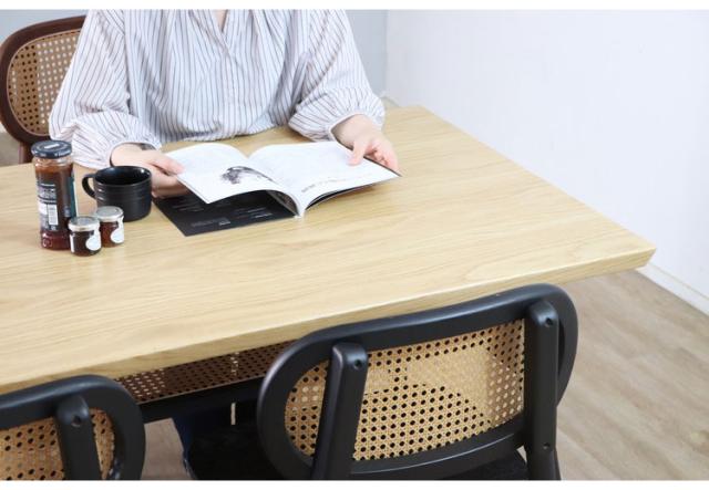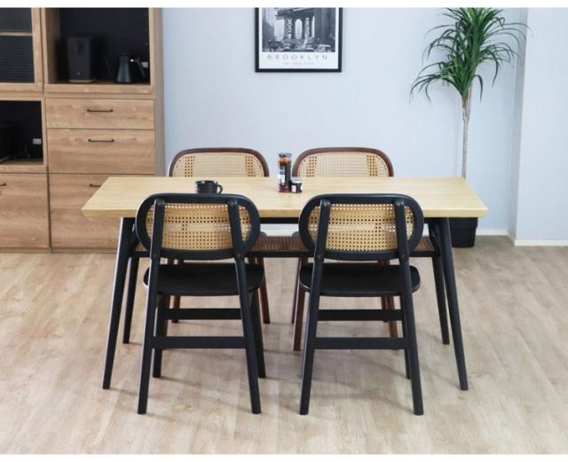 オーク突板の美しい木目と隙間から見えるラタンが絶妙に映えるダイニングテーブル。