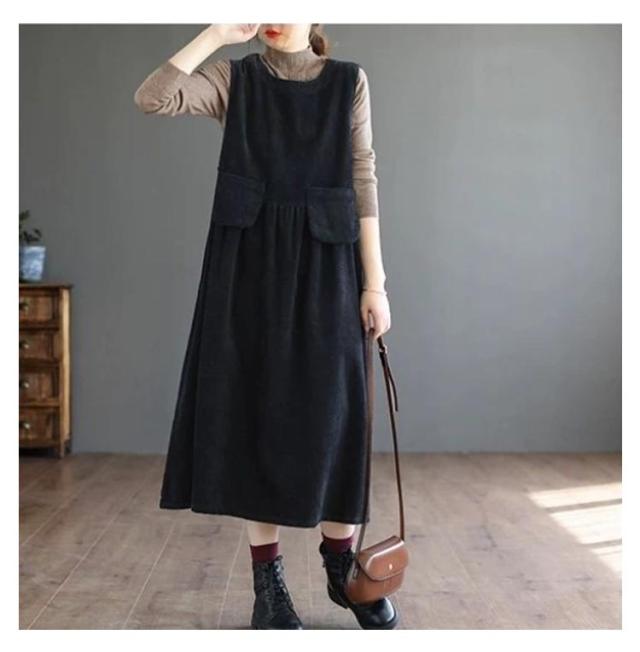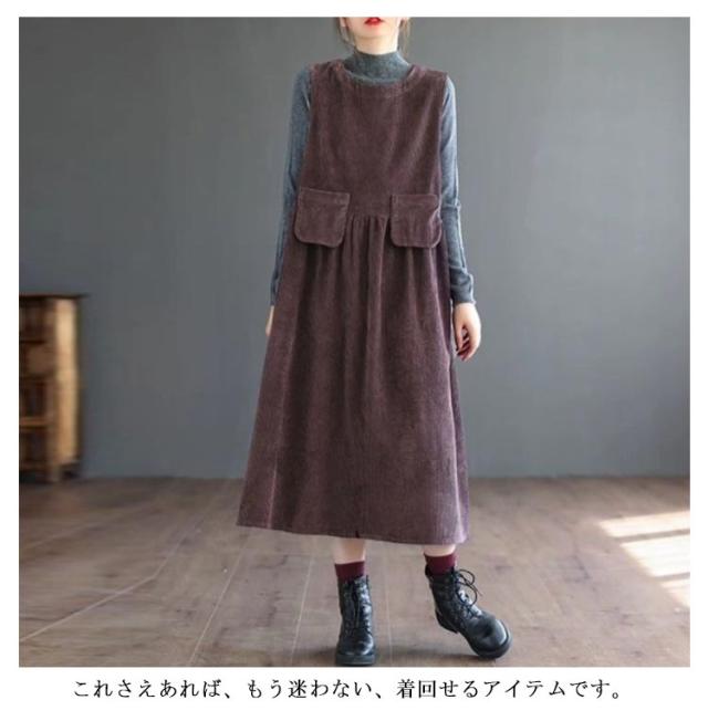 コーデュロイ サロペット ワンピース レディース ロングワンピース ノースリーブ ラウンドネック 春秋 冬 Aライン 体型カバー ポケット付き カジュアル M L XL 2XL 3XL