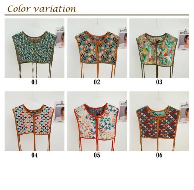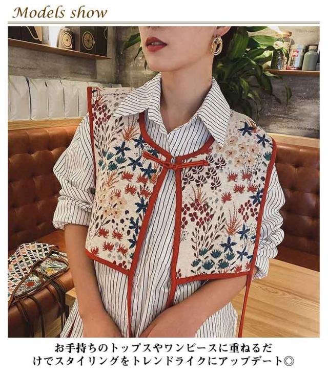 付け襟 刺繍 レディース トップス ショート丈 送料無料 ビスチェ ヴィンテージ風 レイヤード 重ね着 チャイナボタン 刺繍ベスト レトロ 総柄 大人カジュアル 個性的 サイドボタン トレンド