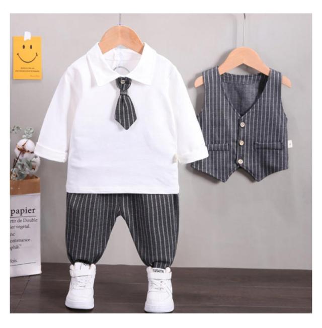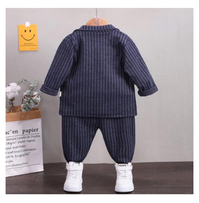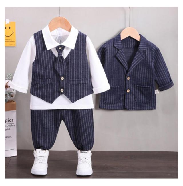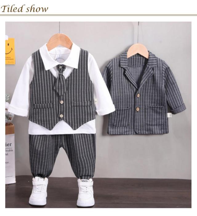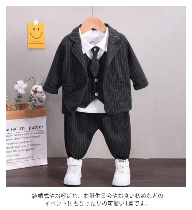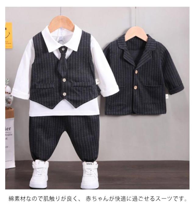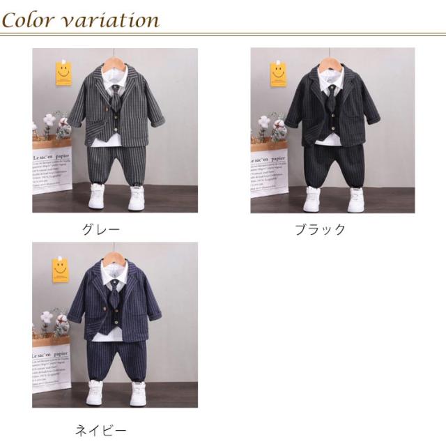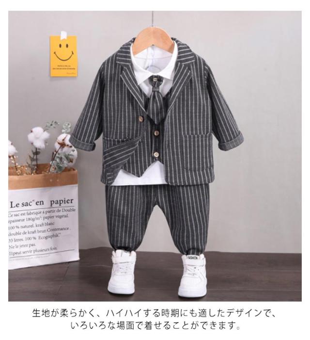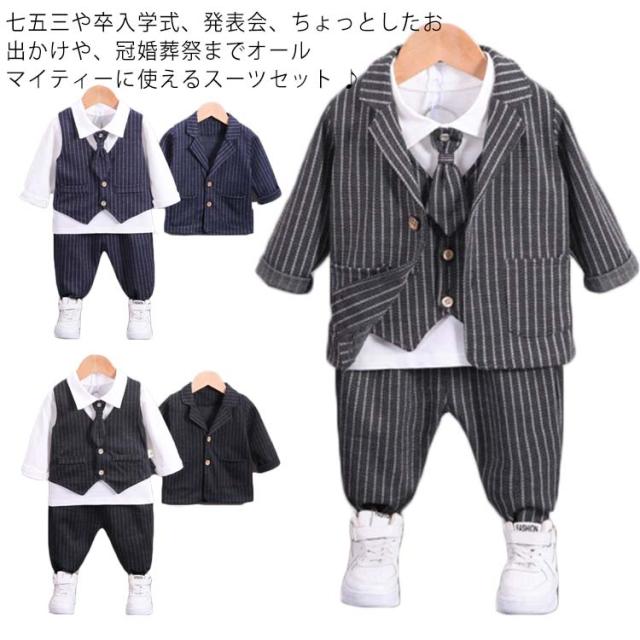 男の子スーツ 子供スーツ 4点セット フォーマル 子供服 蝶ネクタイ付き 長袖ジャケット ベスト ズボン シャツ 男児 上下セット かっこいい ストライプ柄 紳士服 七五三 卒業式 入園式 結婚式 お宮参り お食い初め