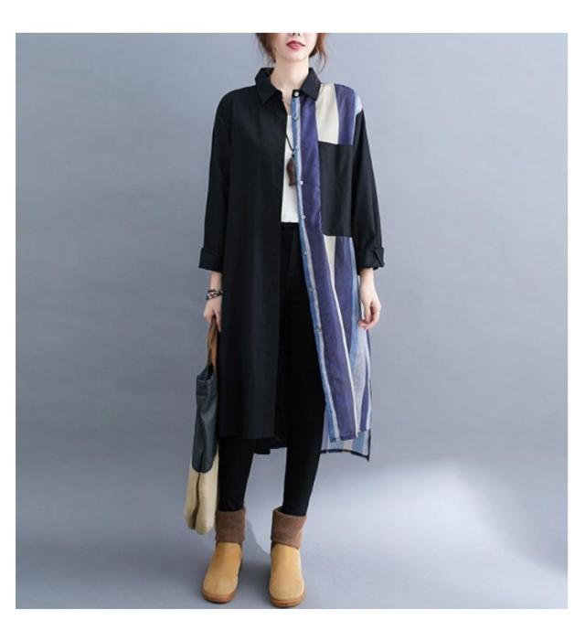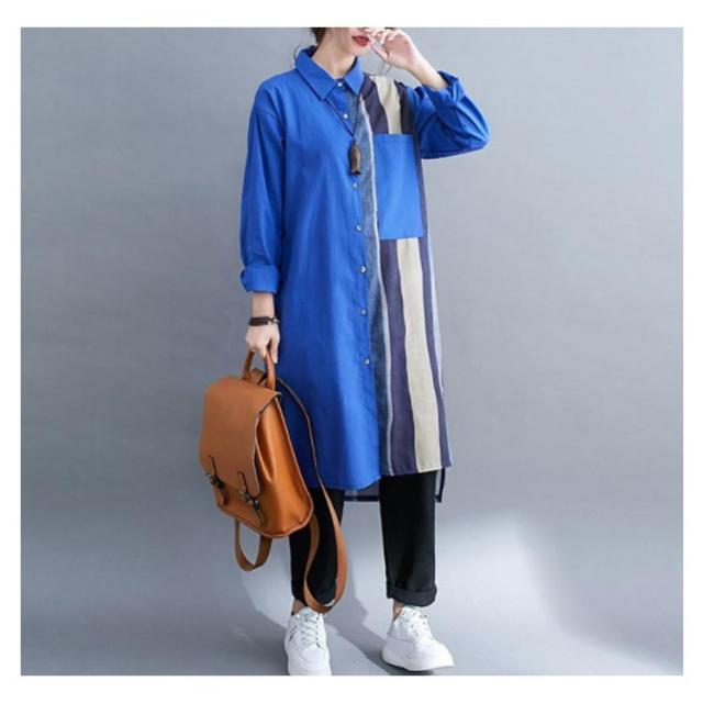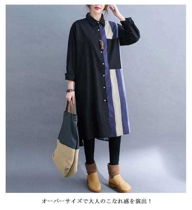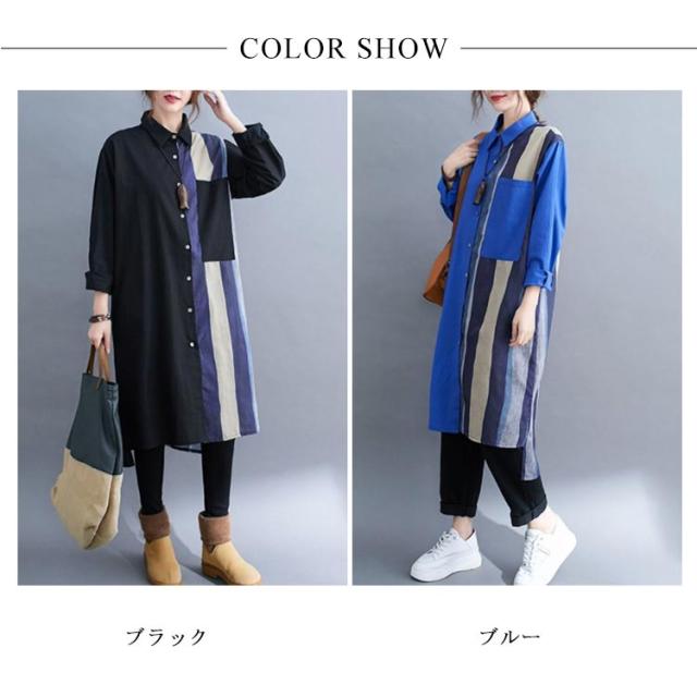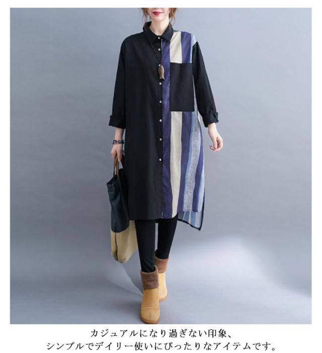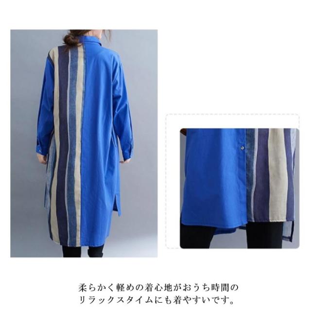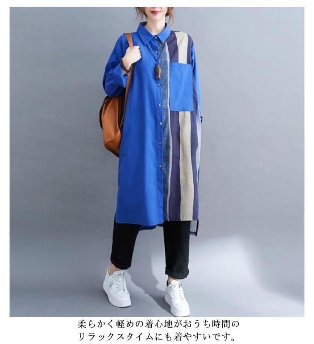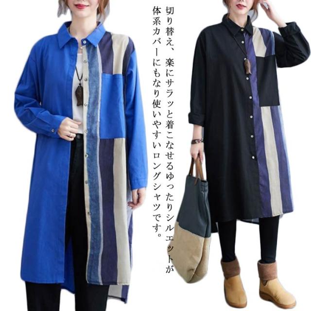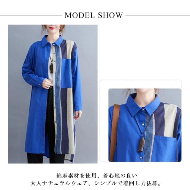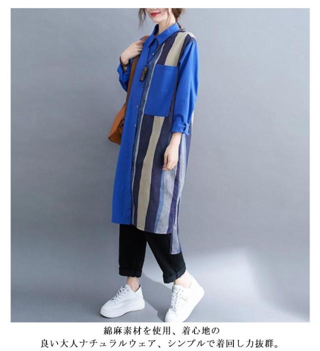 切り替え リネンシャツ ロングシャツ 前開き 綿麻 ストライプ シャツワンピース チュニック カジュアルシャツ 長袖 体型カバー 着痩せ ナチュラル おしゃれ L XL