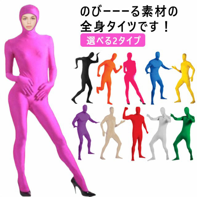 全身タイツ コスチューム 大人用 バックジッパー メンズ レディース 選べる2タイプ 伸縮性あり 顔出しタイプ 忘年会 クリスマス会 パーティー ハロウィン 仮装 変装 文化祭 余興 全12色