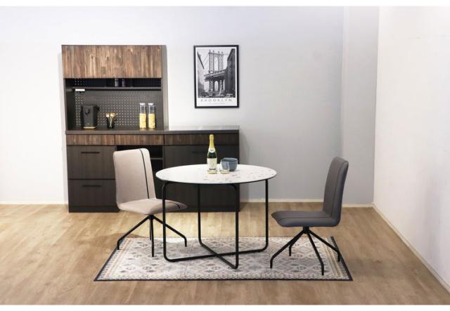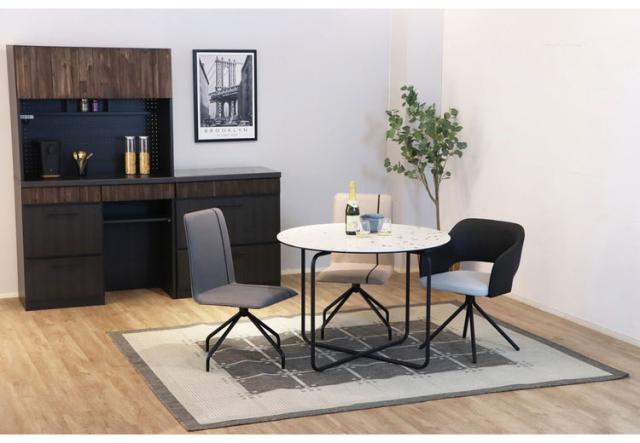 セラミックのテーブルに馴染む、ブラックの縦ラインがアクセントになっている都会的テイストのな回転式のチェア。
