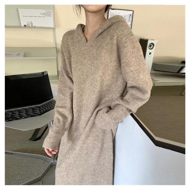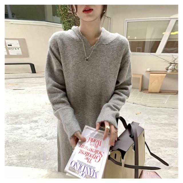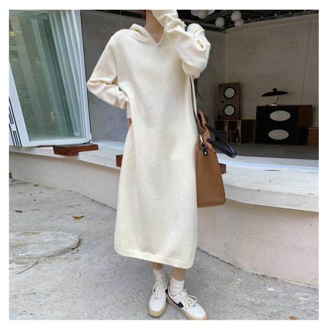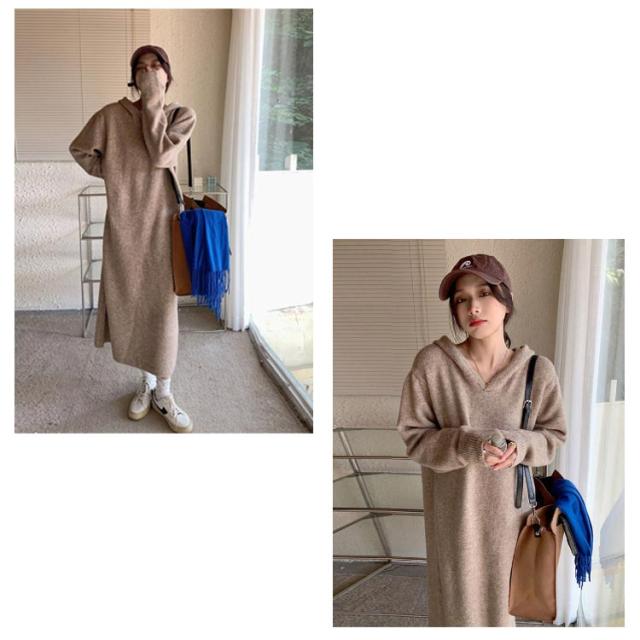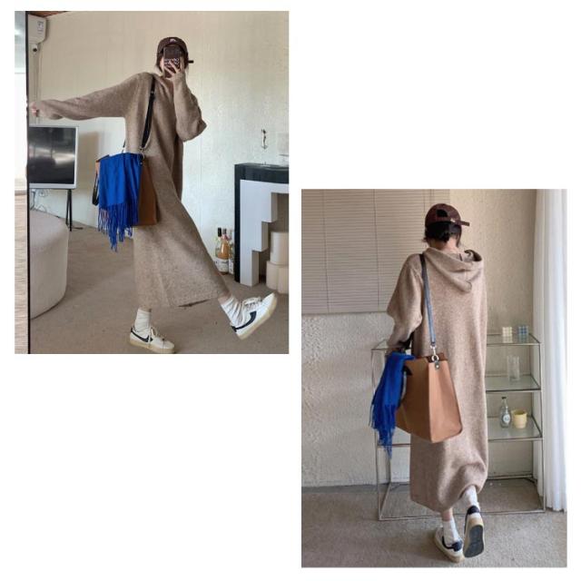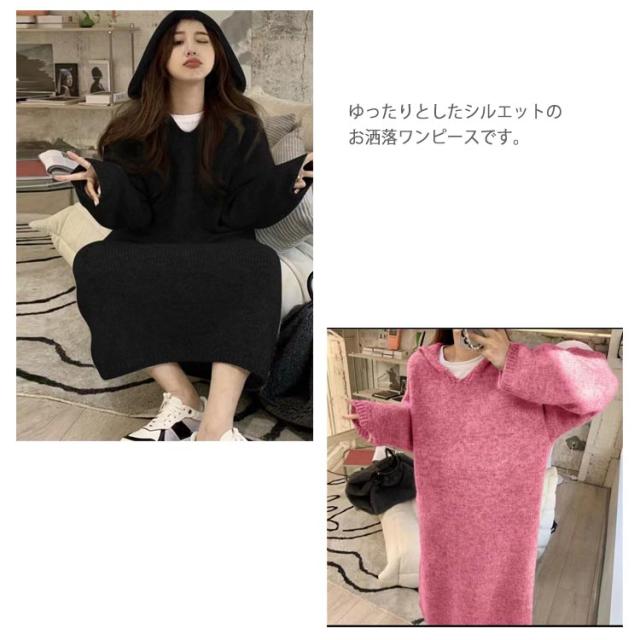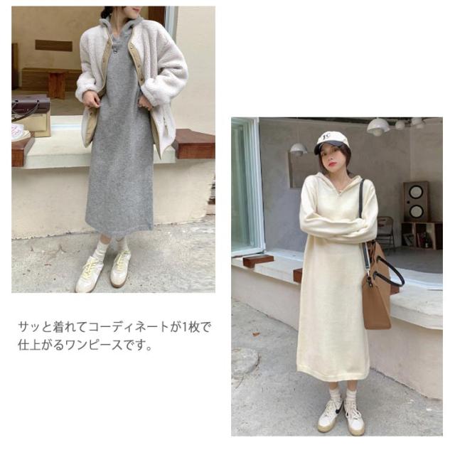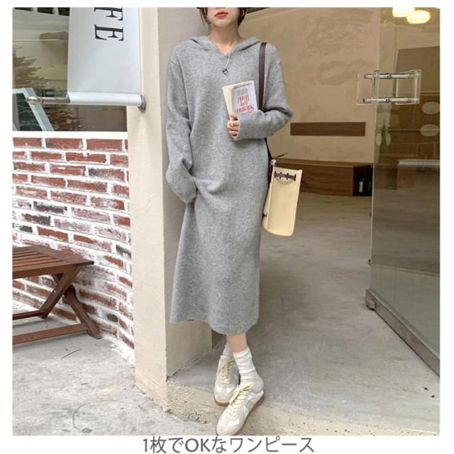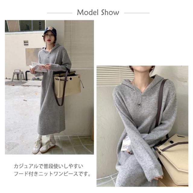 | カジュアルワンピース カジュアルで普段使いしやすいフード付きニットワンピースです。 1枚でOKなワンピース サッと着れてコーディネートが1枚で仕上がるワンピースです。 ゆったりワンピース ゆったりとしたシルエットのお洒落ワンピースです。 | |