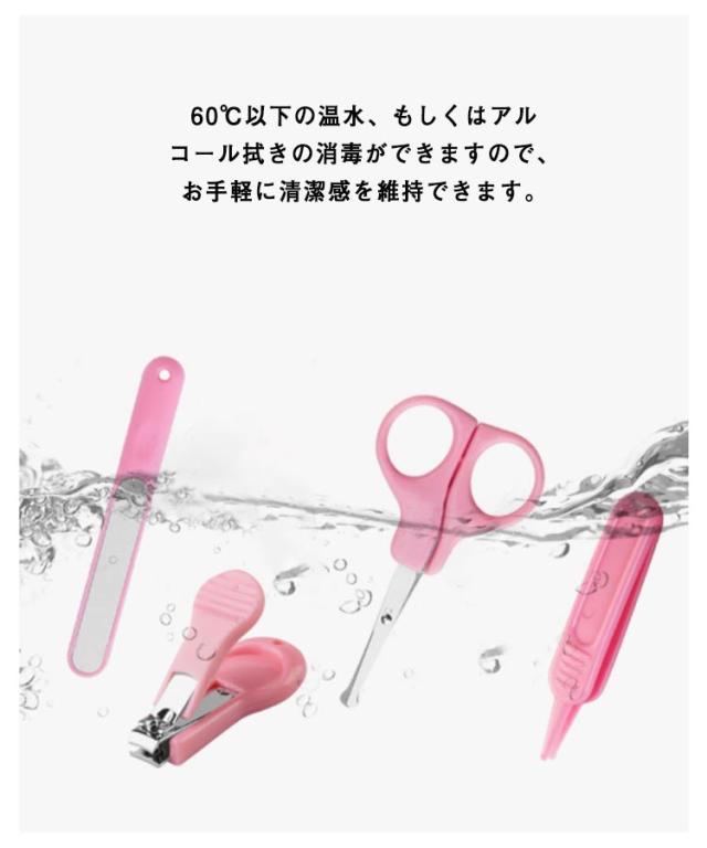| 新生児のお子様から使えるケアグッズの4点セットです。 赤ちゃんの肌優しいABS素材を使用しているので、ママも安心。 爪切りは良質のステンレス刃でさびにくく、力を入れなくともらくらくカット出来ます。 ハサミは握りやすく先が丸い為、赤ちゃんの指を傷つけません。 爪やすり先が丸くなっているので、安心してケアできます。 ピンセットは先が丸く、お鼻の内側を傷つないため安全にケアができます。 60℃以下の温水、もしくはアルコール拭きの消毒ができますので、お手軽に清潔感を維持できます。 | |