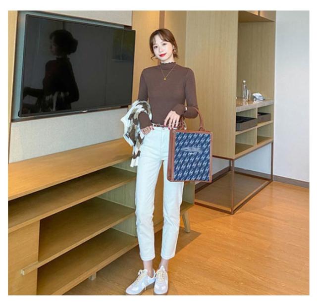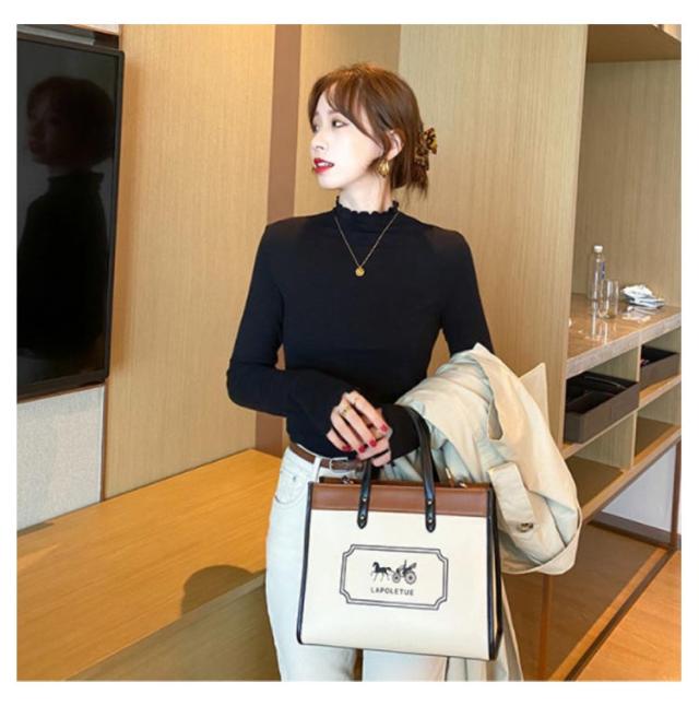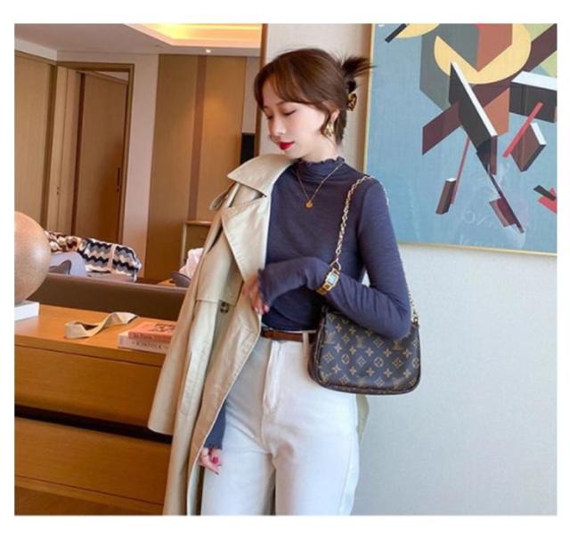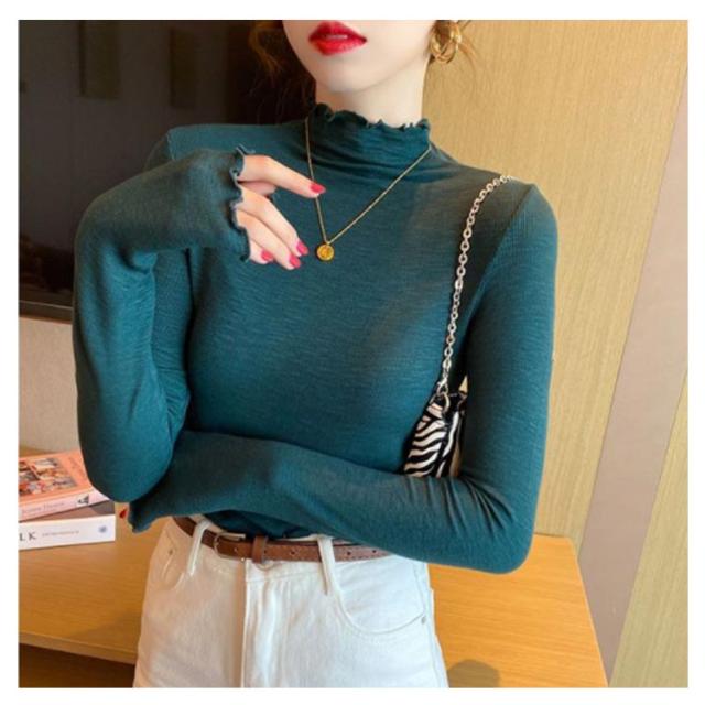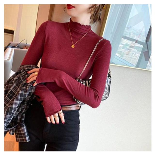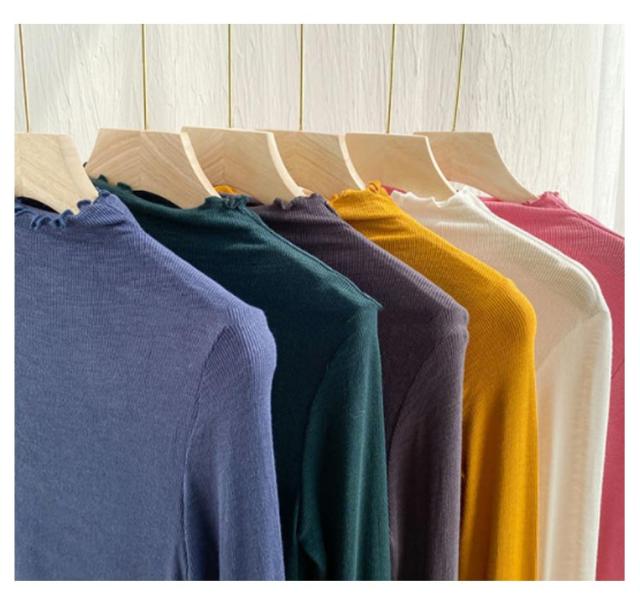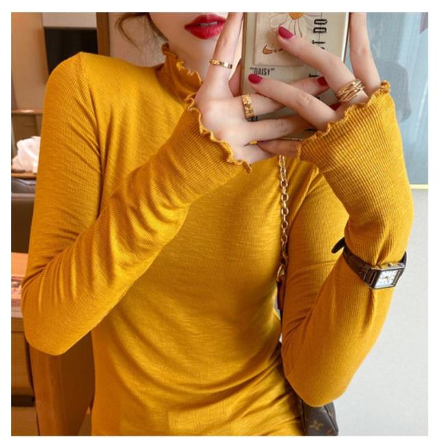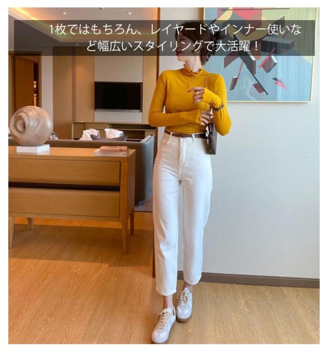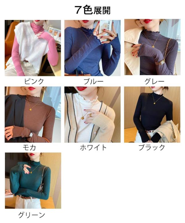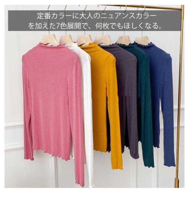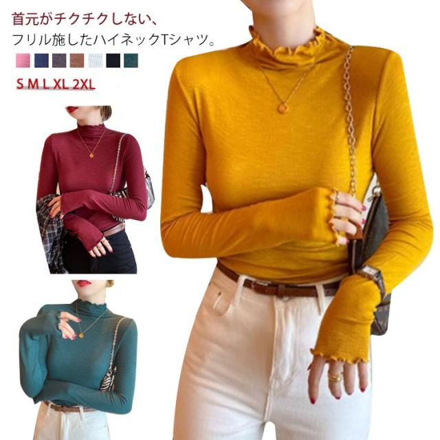 全7色!フリルtシャツ tシャツ レディース ハイネックtシャツ カットソー フリル 長袖tシャツ コットン インナー 秋冬 春服 秋服 無地 キレイめ 着痩せ 送料無料