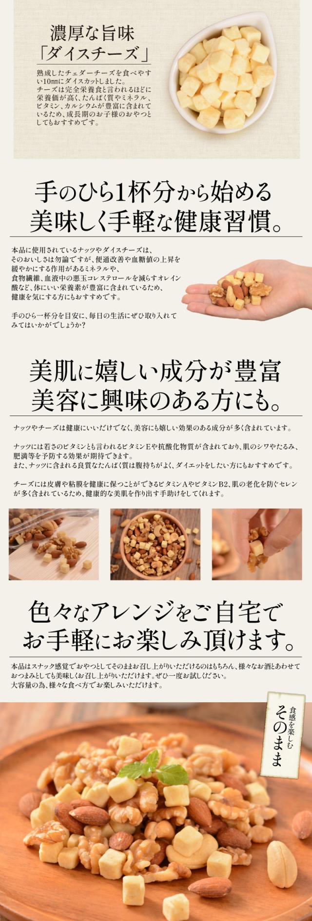 アーモンド(アメリカ産)、カシューナッツ(インド産)、クルミ(アメリカ産、中国産)、ダイスチーズ