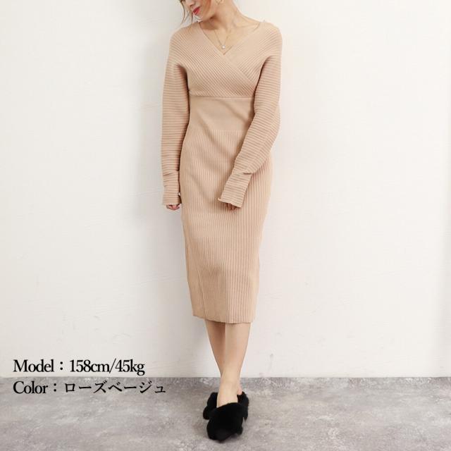 エレガントに女性らしさを引き立てる前後Vネックカシュクールニットワンピースです。