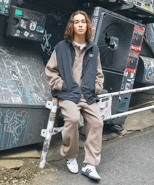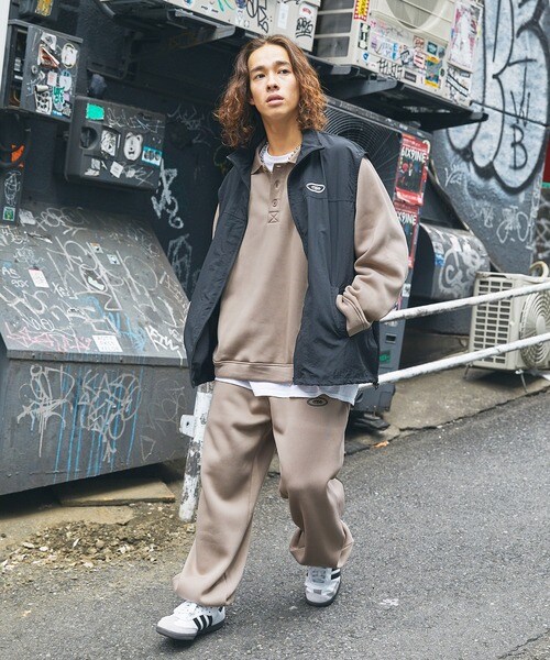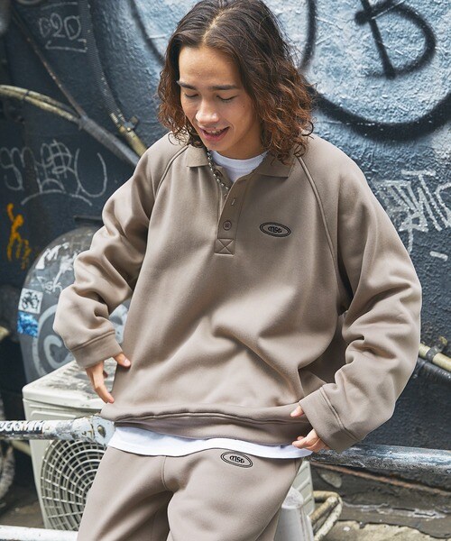 襟付きデザインがトレンドを押さえたプルオーバーとパンツのスウェットセットアップ。
