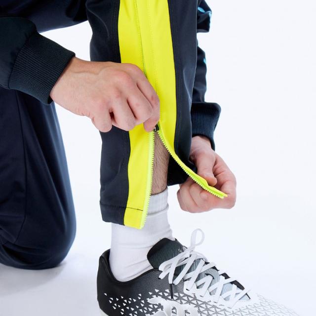 シューズを履いたまま着脱できるよう、裾にロングファスナーを配置、裾口にかけて細くなる