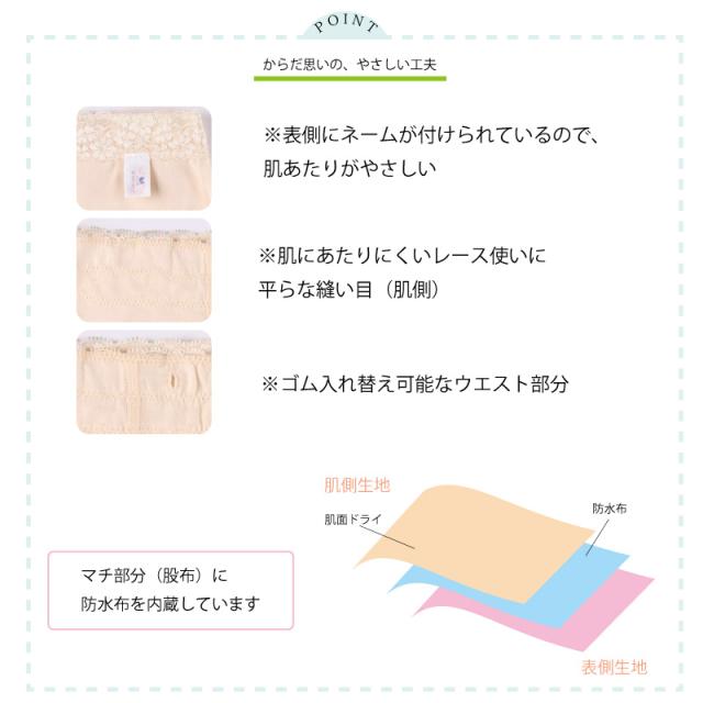 | 素材 | 身生地: 綿95%、ポリウレタン5%、 レース部:ナイロン、ポリウレタン マチ部肌側:ポリエステル60%、綿40% |
