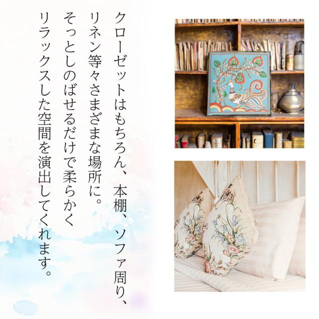 穏やかな香りで、クローゼットやクッション周り、書架などを柔らかく演出できます。