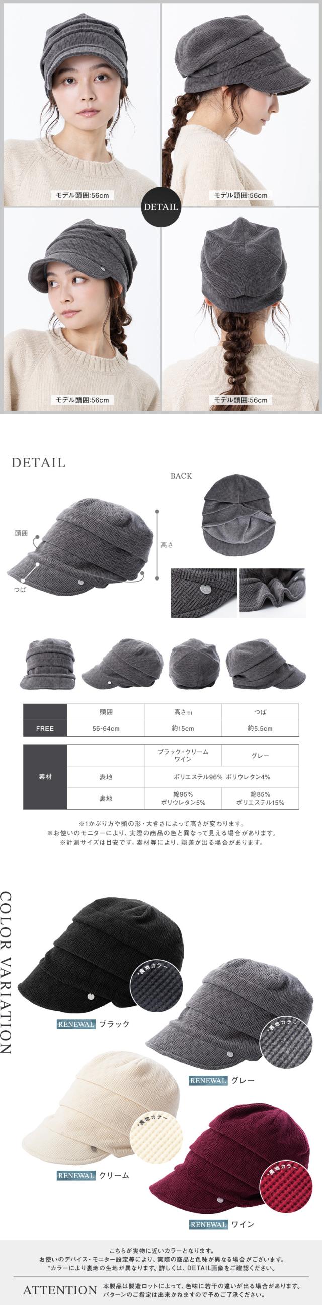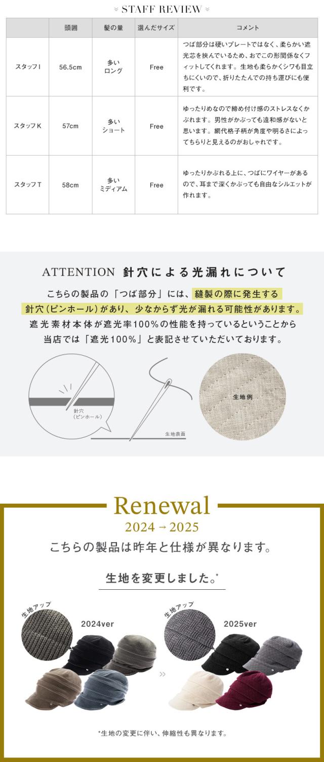 | ・高さはモデル着用時の高さを記載しています。 ・頭囲・高さのサイズ表記は、5ミリ前後の誤差が生じる場合があります。計測サイズは目安としてお考えください。 ・遮光生地の厚さには多少の差異があり、中にはシャカシャカと音がする場合があります。 ・お取り扱いの前に品質ネームタグの記載内容をご確認ください。 ・ご覧頂くモニターの発色具合によって実物と色が異なって見える場合があります。 ・単品商品の撮影画像が実際の商品と色合いが近くなっていますので、ご参照ください。 ・同商品でも、染色過程で色味が多少変わる場合があります。 ・つば先ワイヤー入りです。 |