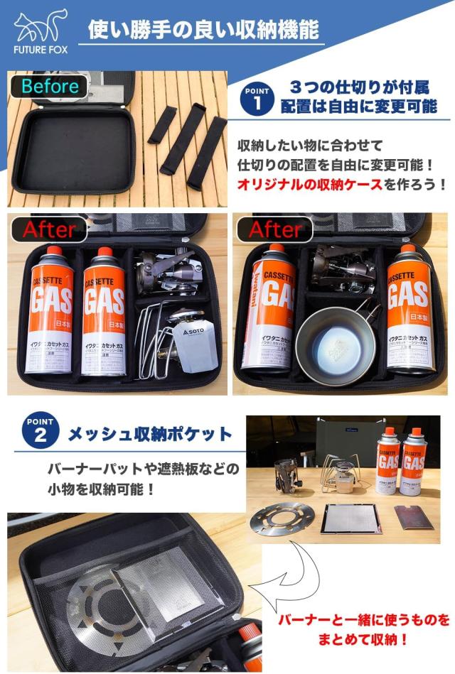 【他のバーナーも収納可能】??本製品はジュニアコンパクトバーナー以外のバーナーも収納することが可能です。SOTO レギュレーターストーブ ST-310、FORE WINDS コンパクトキャンプストーブなどを収納することが可能ですので、ジュニアコンパクトバーナー以外をお持ちの方にもおすすめの商品です。