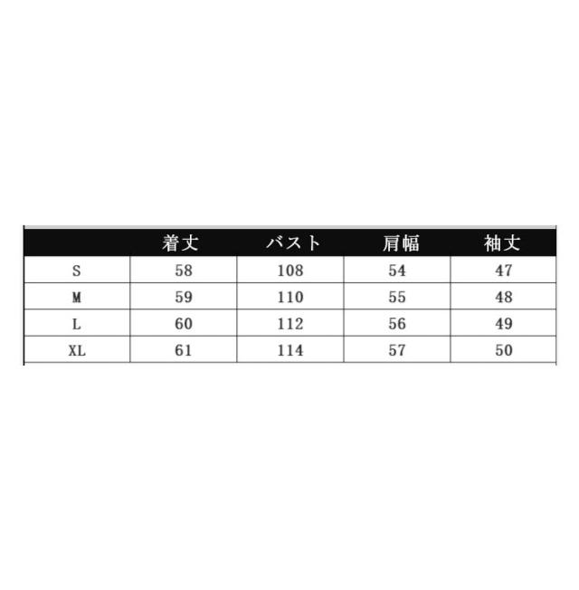 | サイズについての説明 | サイズ 着丈 バスト 肩幅 袖丈 ※サイズ表の実寸法は商品によって1-3cm程度の誤差がある場合がございます。 |