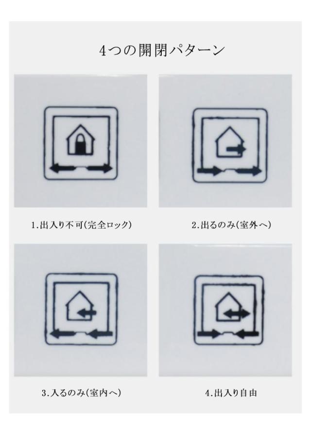 | ・猫の部屋の出入りをサポートするペットドアです。 ・4つの開閉パターン:1.出入り不可(完全ロック)、2.出るのみ(室外へ)、3.入るのみ(室内へ)、4.出入り自由 ・ドアの開閉部分はクリアータイプで、出入りするペットの様子が見れます。 ・磁石付き扉下部には磁石が付いているので、ペットが出入りしても開きっぱなしにはなりません。 ・ドアの内側にはドアブラシがあるため、泥や汚れなども落としやすく、また、猫の身体も傷つけにくいです。 ・ドアの色に合うブラウン色とインテリアに合うホワイト色の2色をご用意しています。 【取り付け方法】 必要な工具:電気ドリル、電動ノコギリ、定規、鉛筆などのペン、ドライバー 1取り付けたいドアに測って、印をつけます。 2本製品を印に当てて、線を書きます。 3「2」でなぞった線からプラス5mmほどの余白を持たせた線を書き、四隅に電動ドリルで穴をあけます。 4穴をあけた箇所にノコギリを刺し、線になぞって切れ目を入れます。 5切れ目を入れたら開いた箇所に本製品を取り付けます。 6反対側のドアにも本製品の片側を取り付け「5」に取り付けた本製品にはめ込みます。 7本製品の四隅にネジ穴があるのでネジを閉めたら取付けが完了になります。 | |