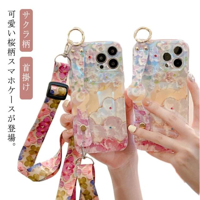 11 12 pro 12 14 ストラップ 送料無料 ハンドストラップ付き タイプ 花柄 サクラ柄 かわいい 桜柄 首掛け アイフォン iPhone ショルダー スマホケース 可愛い 13 max 韓国 13 12 11 Pro Max Xs カバー おしゃれ iPhone iPhone11 iPhone13 ケース 13