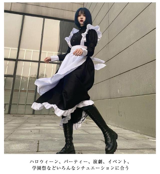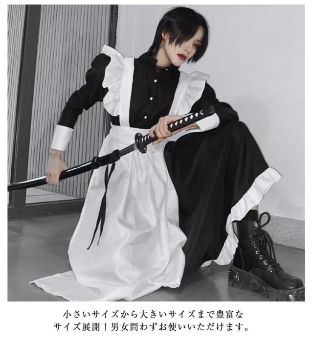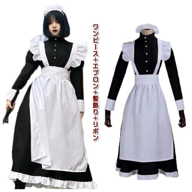 メイド服 ワンピースタイプ 長袖 リボン 4点セット カチューシャ 男性可 エプロン ハロウィン コスプレ かわいい コスチューム 仮装 女装 おしゃれ ロリータ 衣装 男子 女子 大きいサイズ 大人 カフェ イベント 学園祭 文化祭 ロング丈