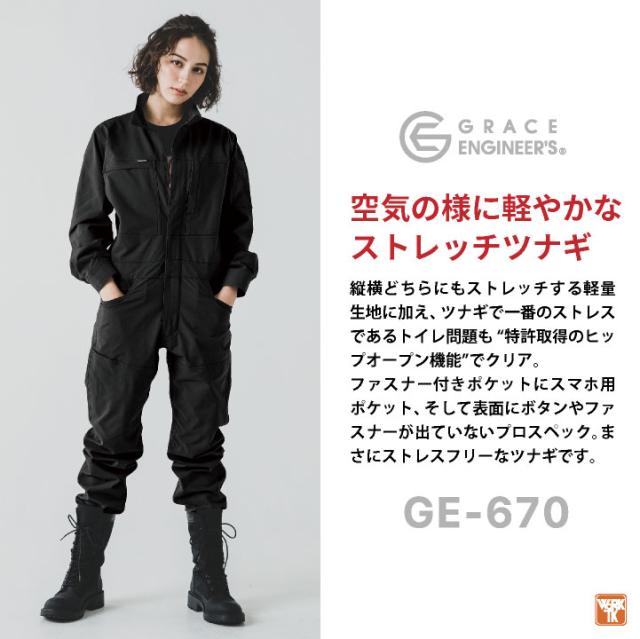 GRACE ENGINEER'S GE-670 エアストレッチツナギ 空気の様に軽やかストレッチツナギ ブラック ネイビー モカブラウン 大きいサイズ 4L 5L
