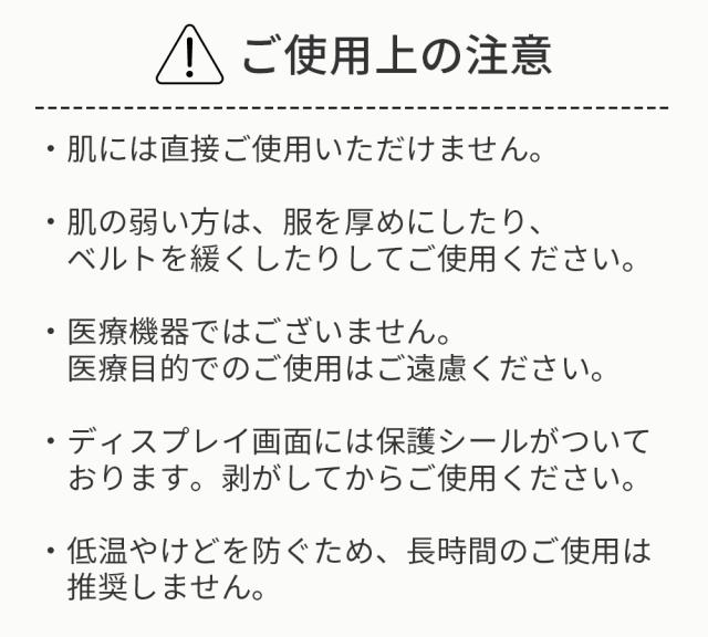ボタン式 簡単操作 3秒で 速暖 温熱ベルト ボタンを押してすぐに温まれる温熱ベルト。 ボタンひとつで電源 / 温度 / 振動が変更できるため、操作も簡単です。 ※肌に直接使用しないでください。