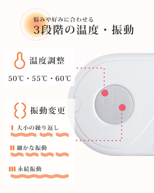 快適に温まれる 温度・振動調節 温度と振動を3種類の中からボタンで選択。 選択中の温度は、ディスプレイ画面に表示されます。