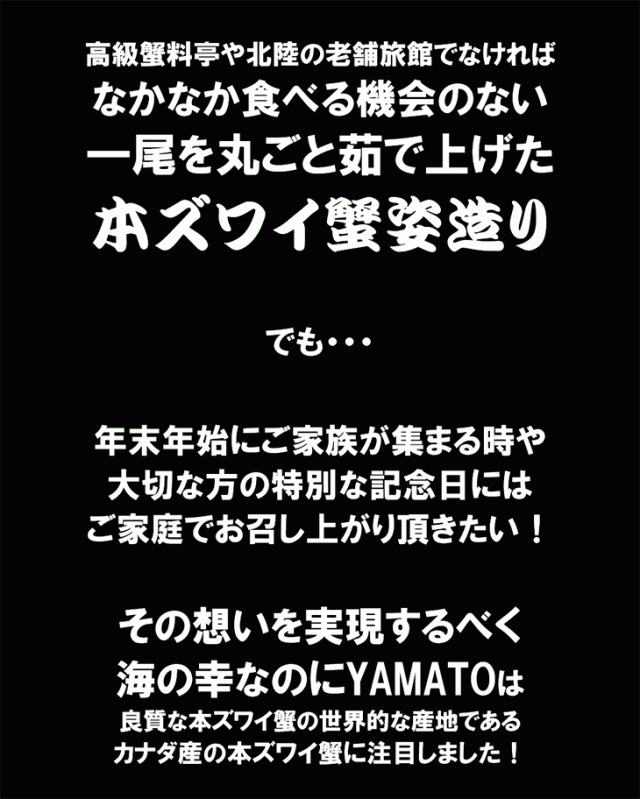 - 期待どおりの美味しさと新鮮さで大満足でした。 これからは、カニを頼む時はまたYAMATOで頼みます。
