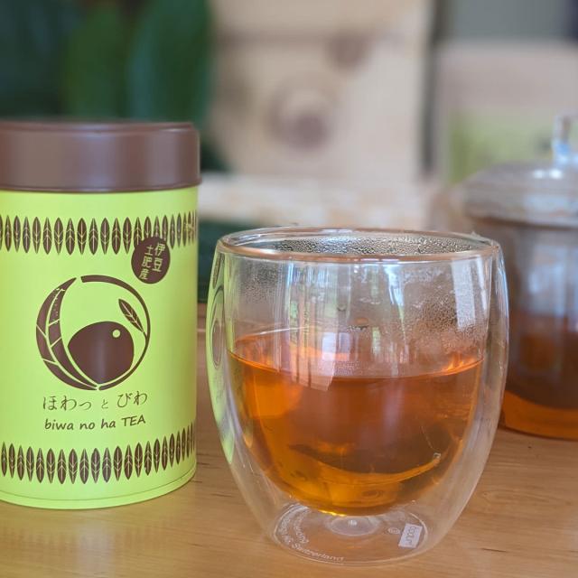 「びわの葉茶 ほわっとびわ茶缶」は、全国でも静岡県伊豆市土肥地区のみで栽培される幻の白びわの葉を使用したびわ茶です。白びわの葉は身体に優しく、昔から民間療法に用いられてきました。ノンカフェインの白びわ茶を味わっていただけます。