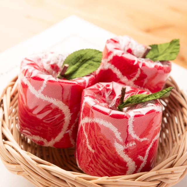 「りんご柄タオルハンカチ みぃ〜つけた」は、青森名産のりんごの形に形成したハンカチの詰め合わせです。りんごの形のかわいらしいパッケージをひろげると鮮やかなタオル地のハンカチになります。青森からのお土産にぴったりな一品です。※日本製、綿100%