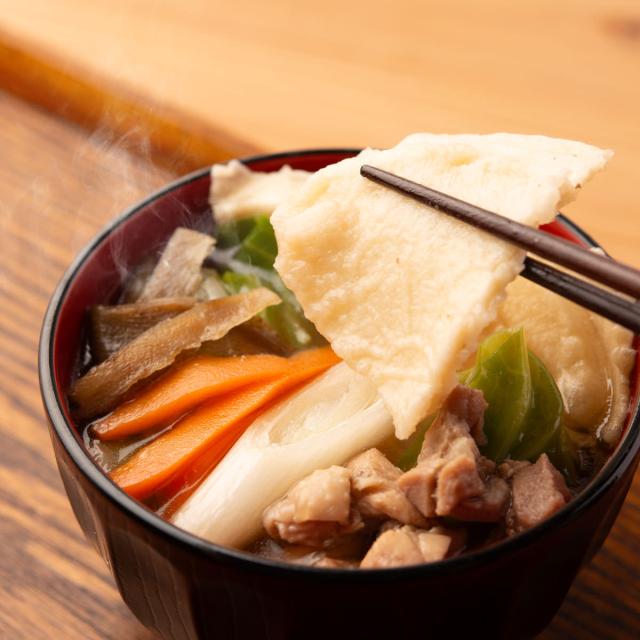 「青森なんぶのせんべい汁」は、鶏肉で出汁を取った醤油ベースのおつゆにごぼう、きのこ、ネギなどを入れて食べる郷土料理です。青森県南部地方で江戸時代から食べられているせんべい汁を温めるだけで食べられます。青森県南部地方には南部煎餅の中でもせんべい汁専用に焼き上げた「かやき煎餅(おつゆ煎餅・鍋用煎餅)」を製造するせんべい屋さんが数多くあります。本場青森で人気の味わいをご賞味ください。