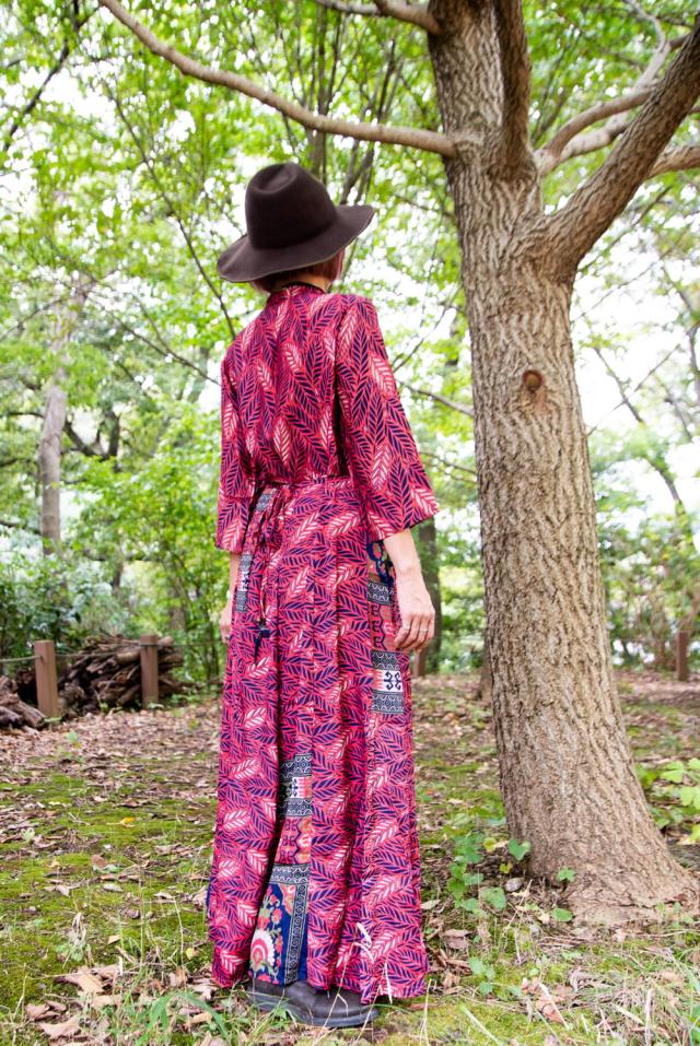 オールドサリーを使用したロングワンピースですウエスト部分の紐で巻き付けて、スッキリしたシルエットになります