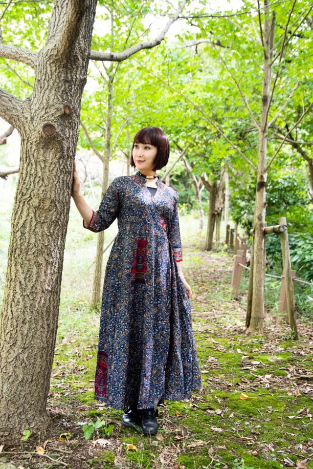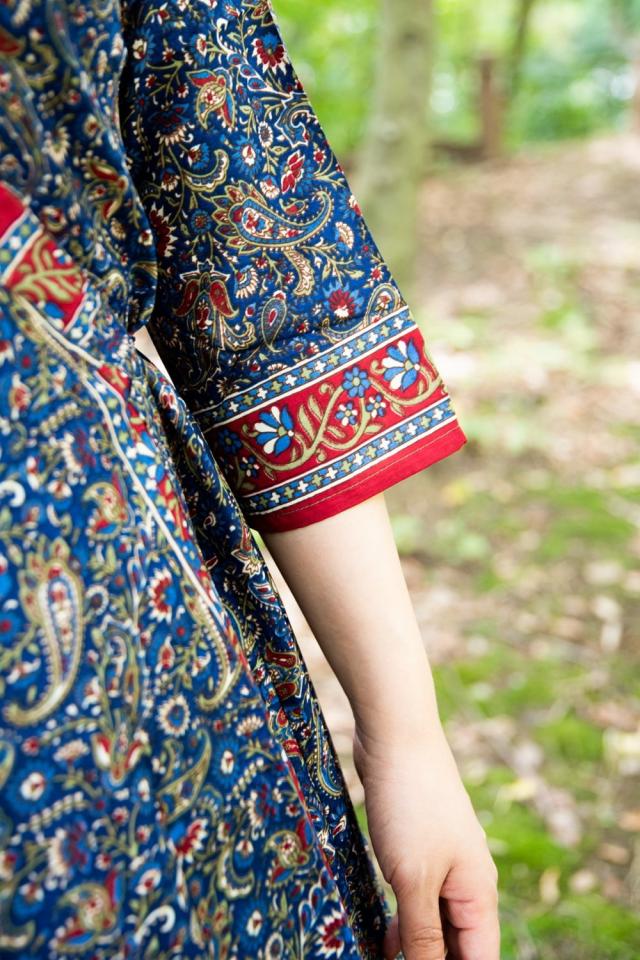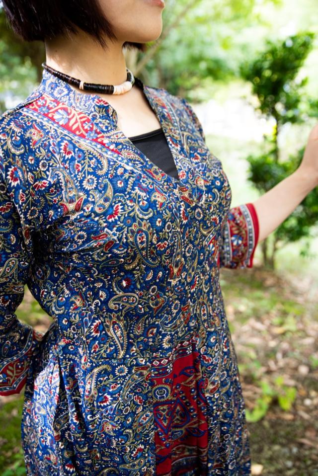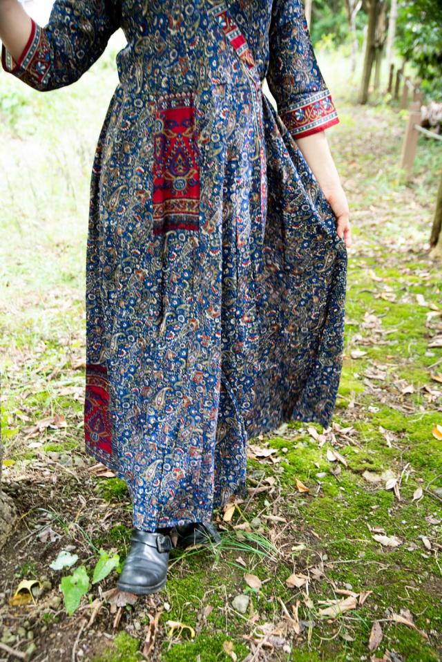 花柄やペイズリー柄のインドのアンティークサリーを使用したラップドレスです。アンティークサリーの風合いを活かして素敵に仕立ててもらいました。胸元はVネックでスッキリとした印象で、下半身は程よいボリュームで上品なシルエットが完成されます。