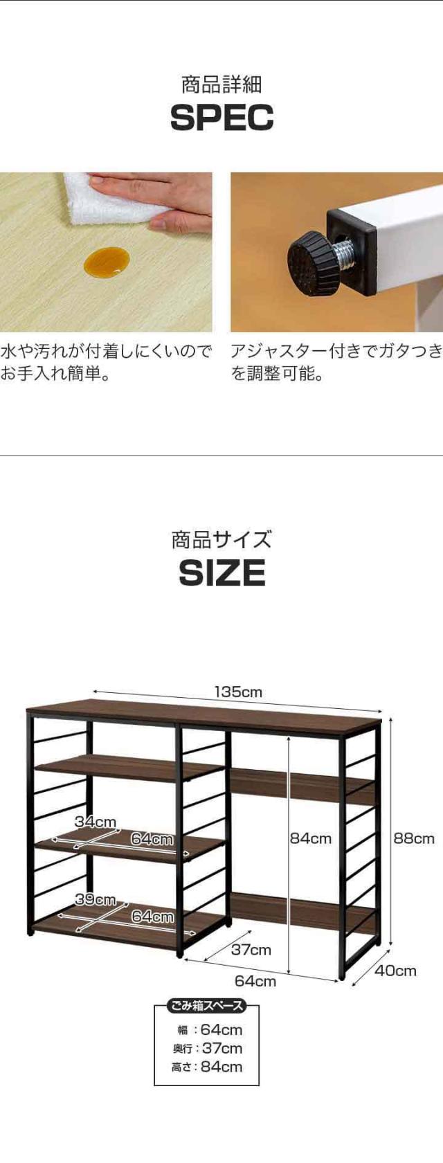 | サイズ: 本体:(約)幅135cm×奥行40cm×高さ88cm ごみ箱スペース:(約)幅64cm×奥行37cm×高さ84cm |