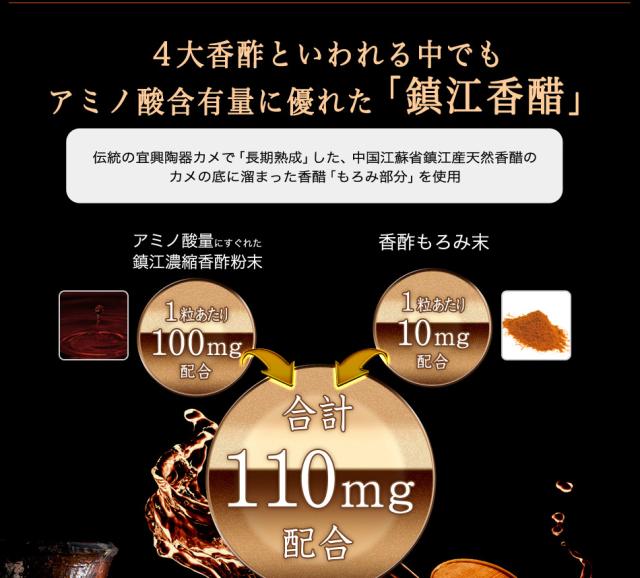 主要原料(1カプセルあたり):江蘇鎮江香酢濃縮末(江蘇鎮江香酢、デキストリン) 100mg / 鎮江香酢もろみ末 10mg /